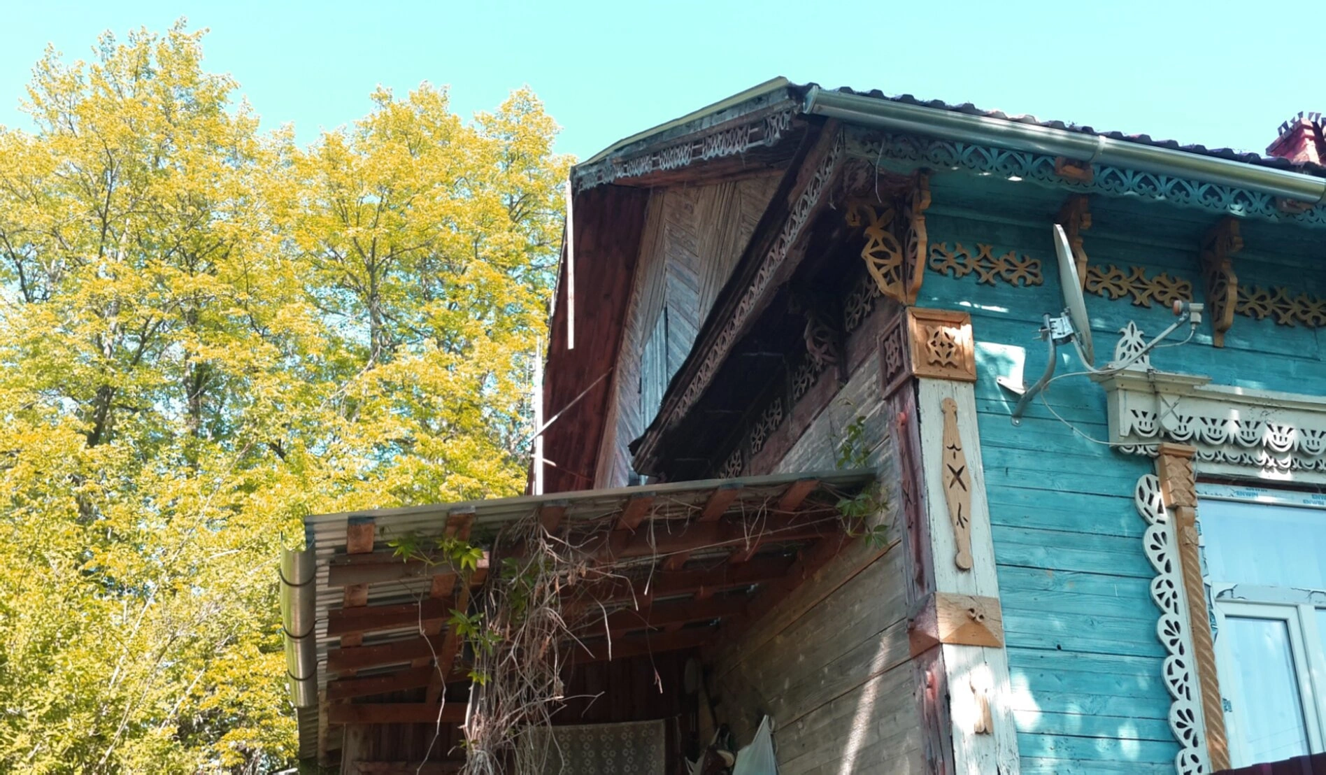 На фотографии видна часть двускатной крыши храма, покрытой современным материалом. В декоративных элементах можно различить христианские символы, напоминающие о крестной жертве Спасителя. Присутствие спутниковой антенны на стене здания свидетельствует о современном использовании храма для богослужебных нужд.