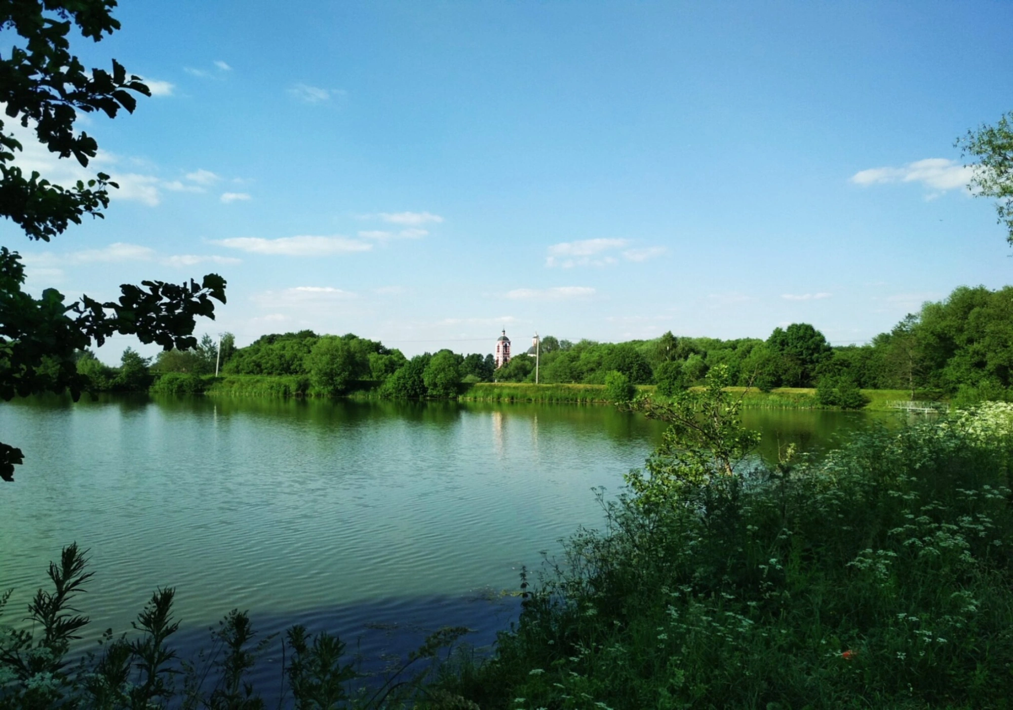 На фотографии запечатлён живописный вид на Церковь иконы Божией Матери Феодоровской в селе Ворсино. Храм расположен на берегу водоёма, что придаёт пейзажу особую гармонию и умиротворение. Передний план занимает водная гладь пруда, отражающая небесную лазурь и прибрежную зелень. На противоположном берегу, среди густого леса, возвышается белоснежное здание церкви с красной кровлей и небольшим куполом, увенчанным православным крестом. Задний план представляет собой ясное голубое небо с лёгкими облаками.
