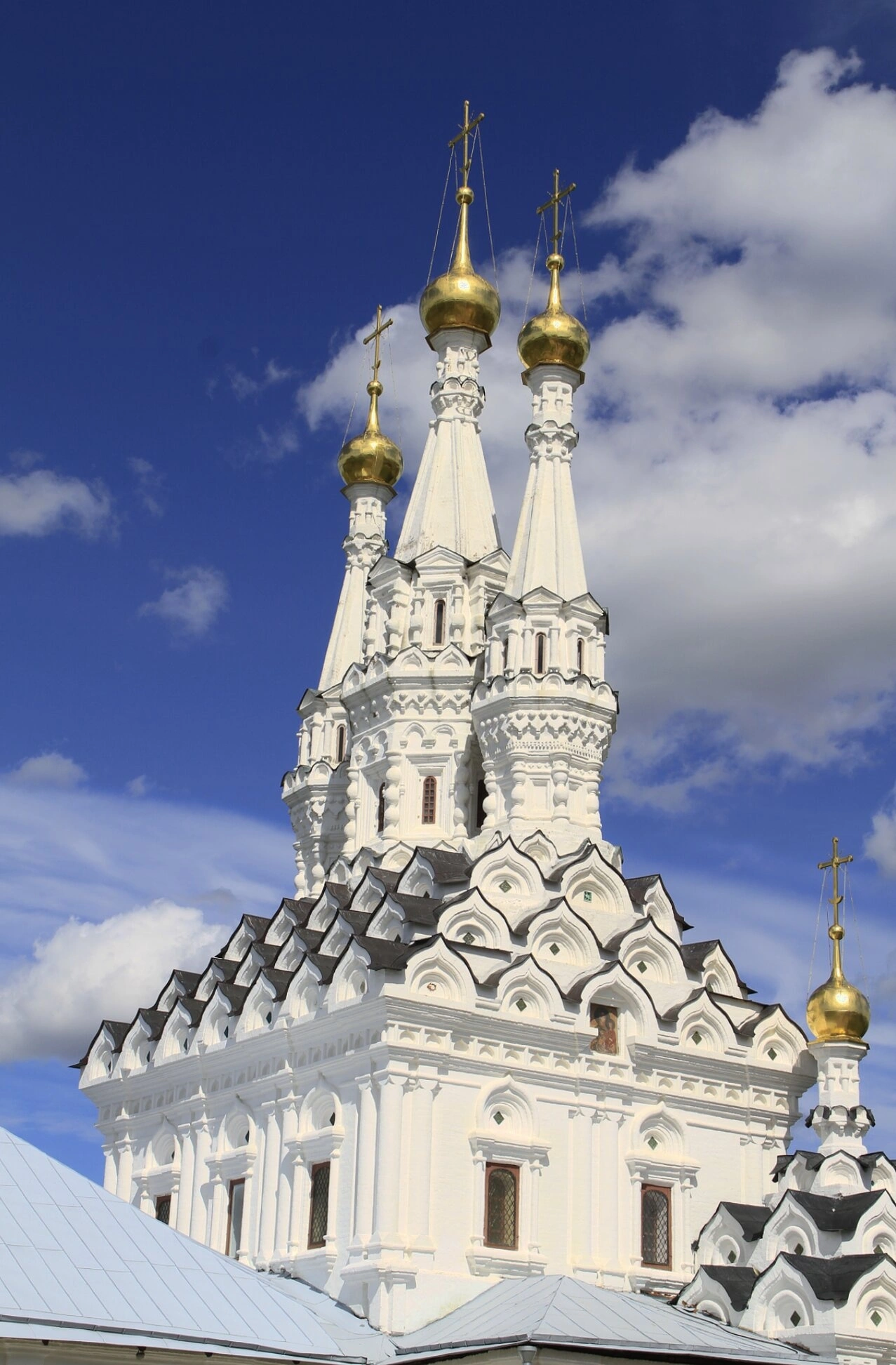 На представленной фотографии запечатлен величавый образ Церкви во имя Смоленской иконы Божией Матери Одигитрии, что пребывает в древнем Иоанно-Предтеченском монастыре города Вязьмы. Снимок, сделанный снизу вверх, позволяет в полной мере оценить устремленную в небо композицию этого уникального храма, подчеркивая его духовную и архитектурную доминанту.