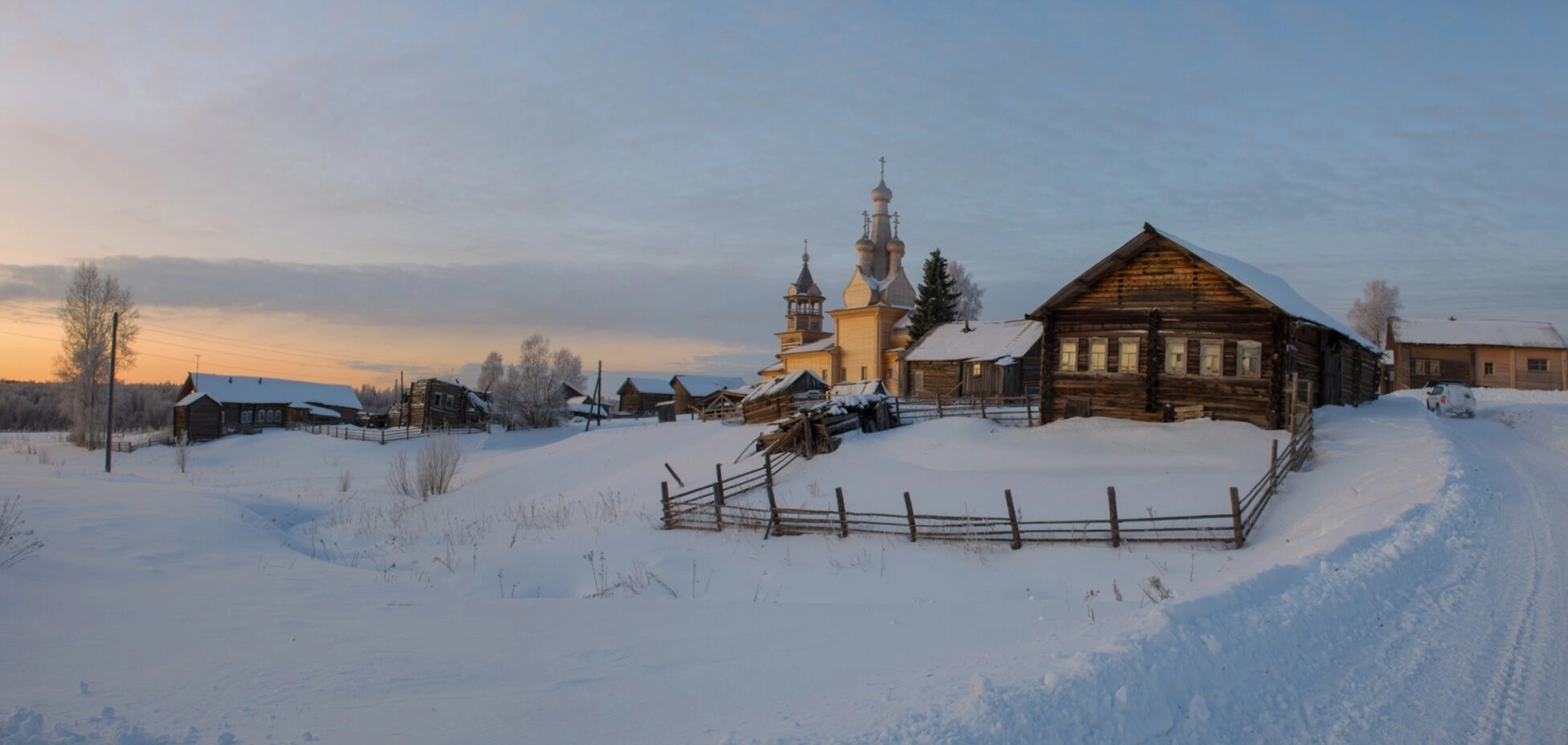 На снимке храм предстаёт в зимнем уборе, окружённый традиционными поморскими избами. Мягкое предрассветное или закатное освещение подчёркивает благородные формы древней церкви, создавая образ духовной твердыни Русского Севера, веками хранящей веру и традиции предков в суровых условиях поморского края.