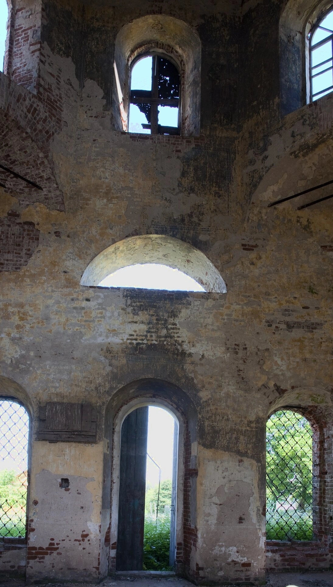 На представленной фотографии запечатлен интерьер Церкви иконы Божией Матери «Всех Скорбящих Радость», расположенной в селе Ассаурово Московской области. Святыня, возведенная в XIX веке, демонстрирует характерные черты русской храмовой архитектуры, включая арочные оконные и дверные проемы, а также массивные кирпичные стены. Несмотря на состояние забвения, прослеживаются элементы былого величия: сводчатые конструкции и остатки штукатурного декора.