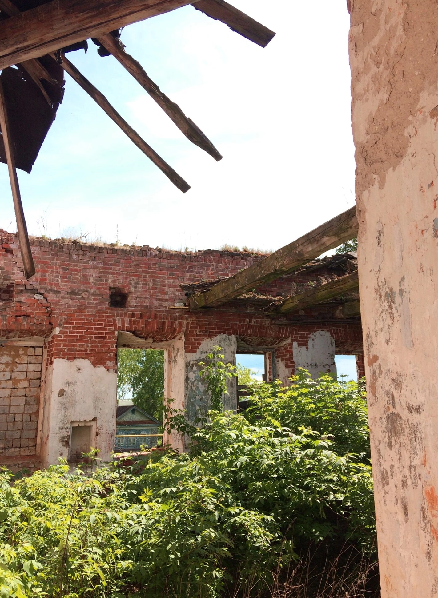 Сохранившиеся стены из красного кирпича, частично сохранившие штукатурное покрытие, свидетельствуют о былом благолепии этого святого места. Деревянные балки, прежде поддерживавшие церковные своды, ныне обрушились под воздействием времени и стихий. Сквозь провалы в кровле и оконные проёмы, лишённые оконниц, проникает божественный свет, озаряющий разросшуюся внутри храма растительность, что символически напоминает о вечной жизни, побеждающей тление.
