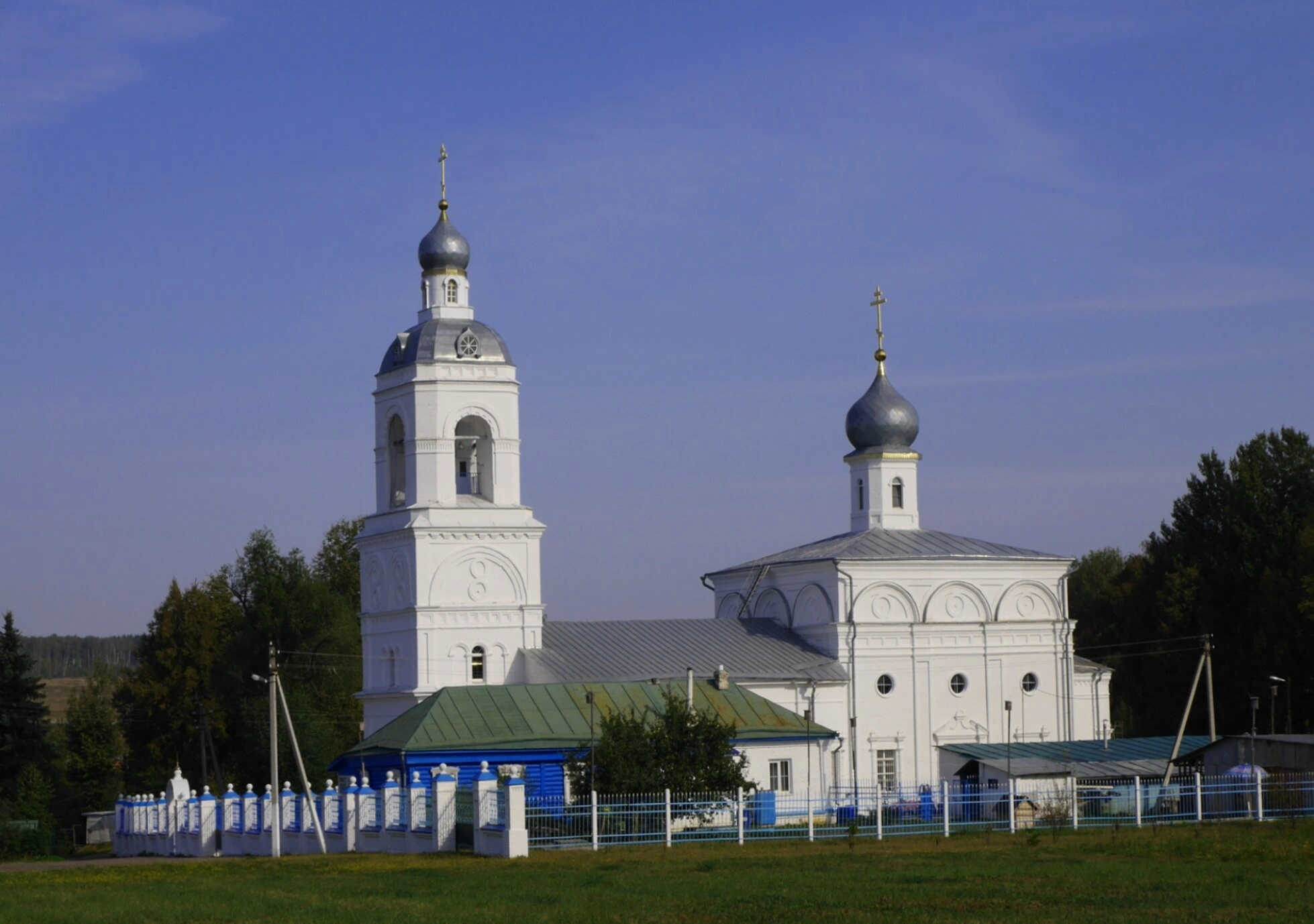 К основному зданию примыкает небольшая пристройка с синей кровлей, вероятно, выполняющая функции служебного помещения. Территория вокруг храма благоустроена: перед церковью установлена аккуратная белая ограда с синими элементами, за которой простирается зелёное поле. По сторонам от храма растут лиственные деревья, а на заднем плане виднеется лесной массив, создающий естественное обрамление для святыни.