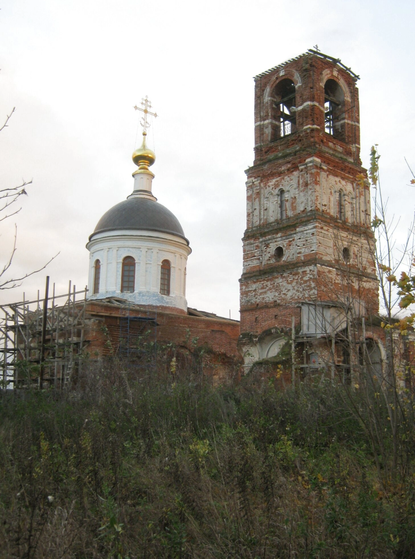 Слева расположен основной храм, увенчанный белым куполом с золоченым православным крестом. Стены храма выполнены из кирпича и находятся в значительно лучшем состоянии compared to колокольней, что указывает на проведенные ранее реставрационные работы или более позднюю постройку.