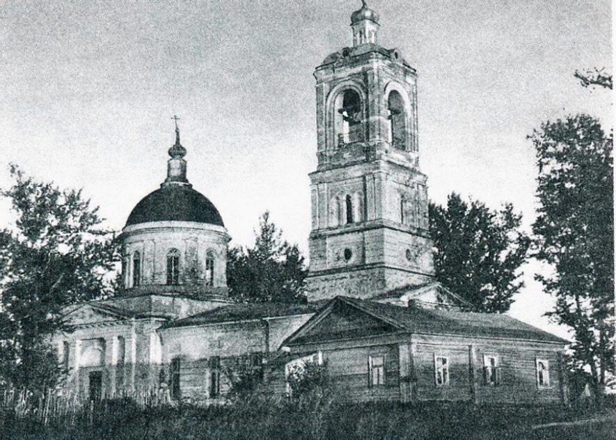 К основному объёму через трапезную соединена колокольня. В трапезной части находятся Никольский и Иоанно-Предтеченский приделы. На снимке также видно одноэтажное здание с двускатной крышей, вероятно, приходской дом или помещение церковно-приходской школы, существовавшей при храме.