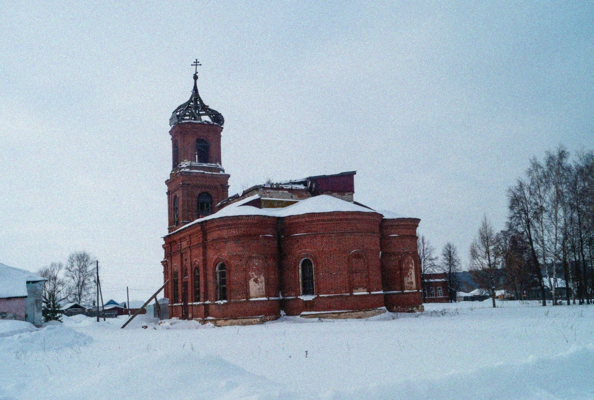 На дальнем плане просматриваются другие строения села Большие Печёрки, также покрытые снегом. Общая композиция фотографии передаёт атмосферу русской зимней природы и демонстрирует уникальный памятник православной культуры, нуждающийся в сохранении и восстановлении для будущих поколений.