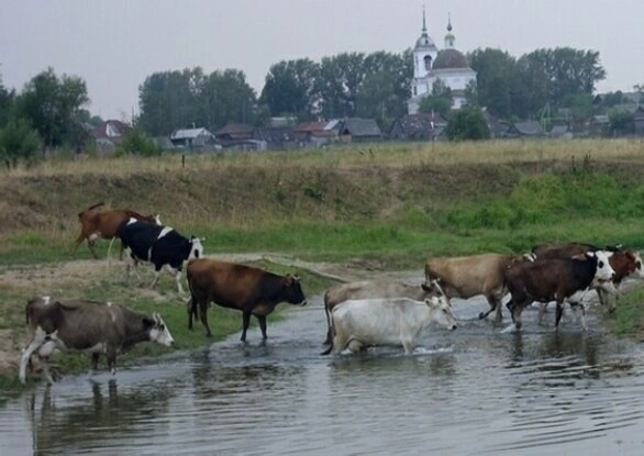 На представленной фотографии запечатлён живописный вид на сельскую местность с доминирующим в панораме белокаменным храмом. На переднем плане изображена неширокая речка, через которую переправляется стадо коров, что придаёт сцене особый pastoralный колорит и передаёт атмосферу размеренной деревенской жизни.