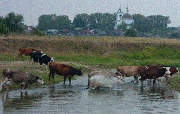 На переднем плане фотографии открывается пасторальная сцена: стадо коров переходит через мелководный водоём, что создаёт удивительный контраст между духовным символом храма и простой сельской жизнью. Этот бытовой эпизод подчёркивает неразрывную связь между православной верой и повседневным укладом русской деревни.