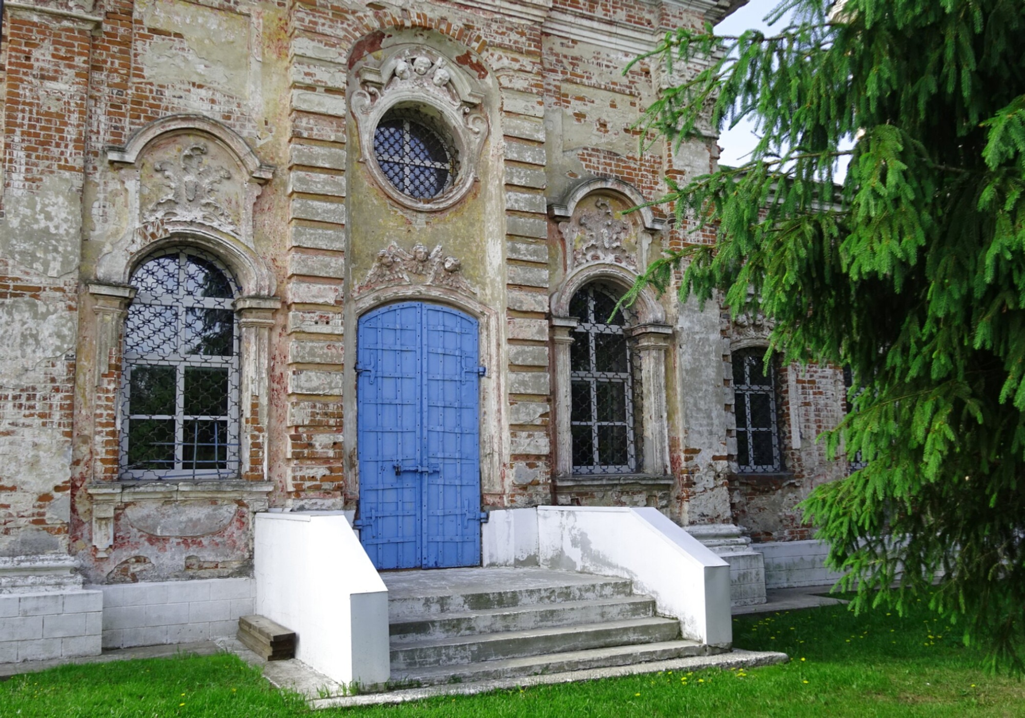 Церковное здание было возведено в 1780-х годах и представляет собой прекрасный образец русского классицизма. На снимке хорошо виден главный вход в храм, обрамлённый массивной синей дверью, которая символизирует небесную чистоту и благодать. Фасад выполнен из красного кирпича, характерного для церковного зодчества средней полосы России. Со временем кирпичная кладка приобрела благородный налёт старины, что придаёт сооружению особое духовное величие.
