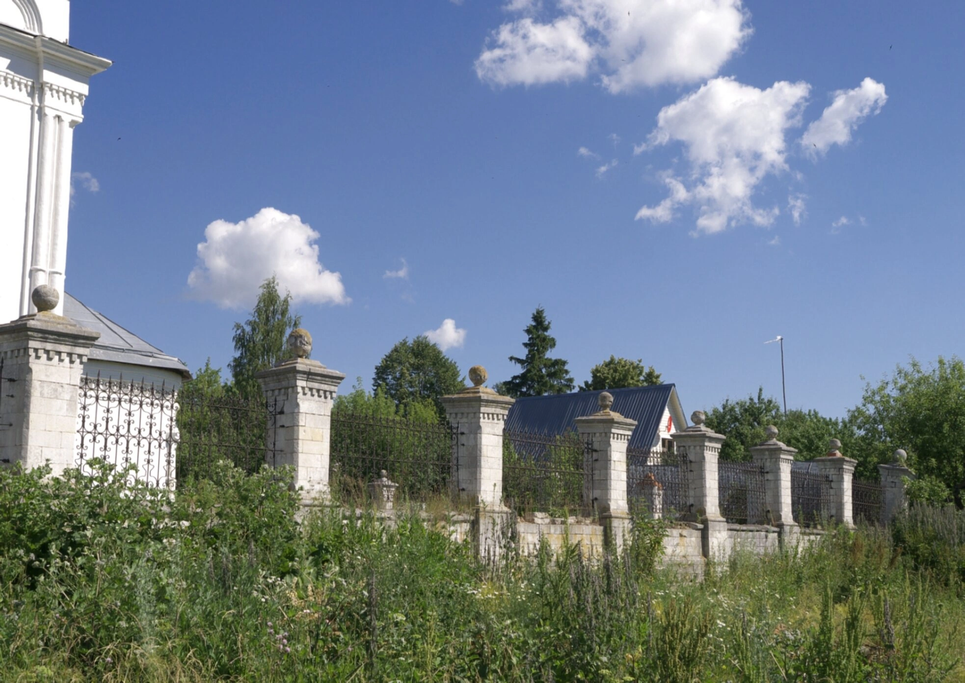 Вдоль ограды наблюдается естественная растительность — высокая трава и кустарники, что создаёт ощущение единства творения Божия и рукотворного храма. Ясное голубое небо с кучевыми облаками подчёркивает величие и духовную значимость православной святыни.