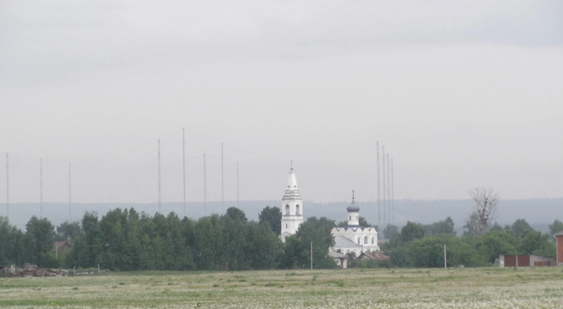 Окружающий пейзаж создаёт атмосферу умиротворения и духовной сосредоточенности. Храм гармонично вписан в природное пространство, окружённое полями и лесными массивами. На заднем плане просматриваются инженерные сооружения, возможно, линии электропередач, что свидетельствует о близости современной инфраструктуры. С правой стороны кадра виден фрагмент жилого строения, подчёркивающий единство духовного и мирского в жизни сельской общины.