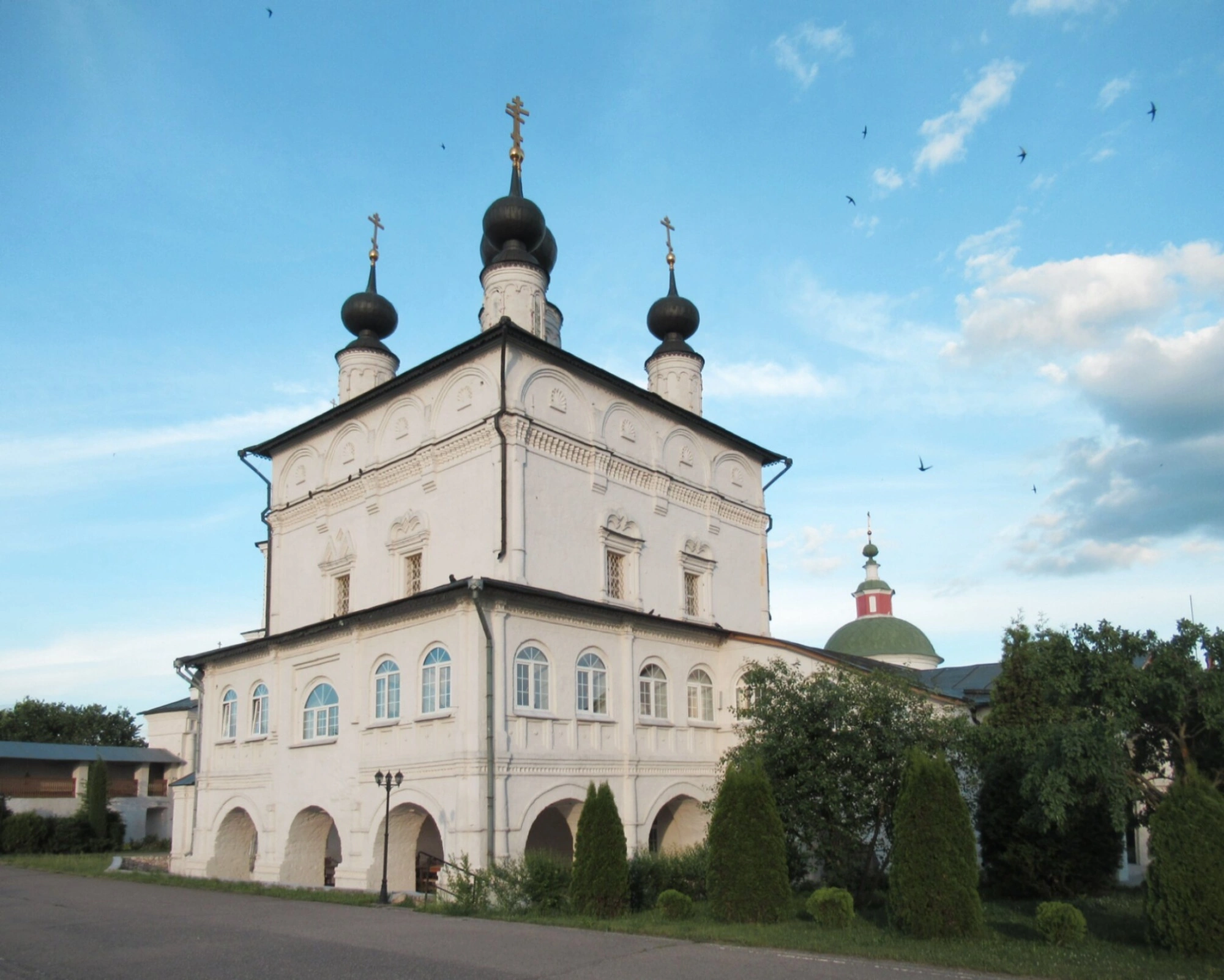 На фотографии хорошо просматривается основной объем храма, увенчанный традиционным пятиглавием, символизирующим Иисуса Христа и четырёх евангелистов. Фасад здания украшен кирпичным узорочьем, характерным для храмового строительства XVII столетия. Церковь расположена в живописном месте на высоком берегу реки Оки, что добавляет особого величия всему монастырскому комплексу.