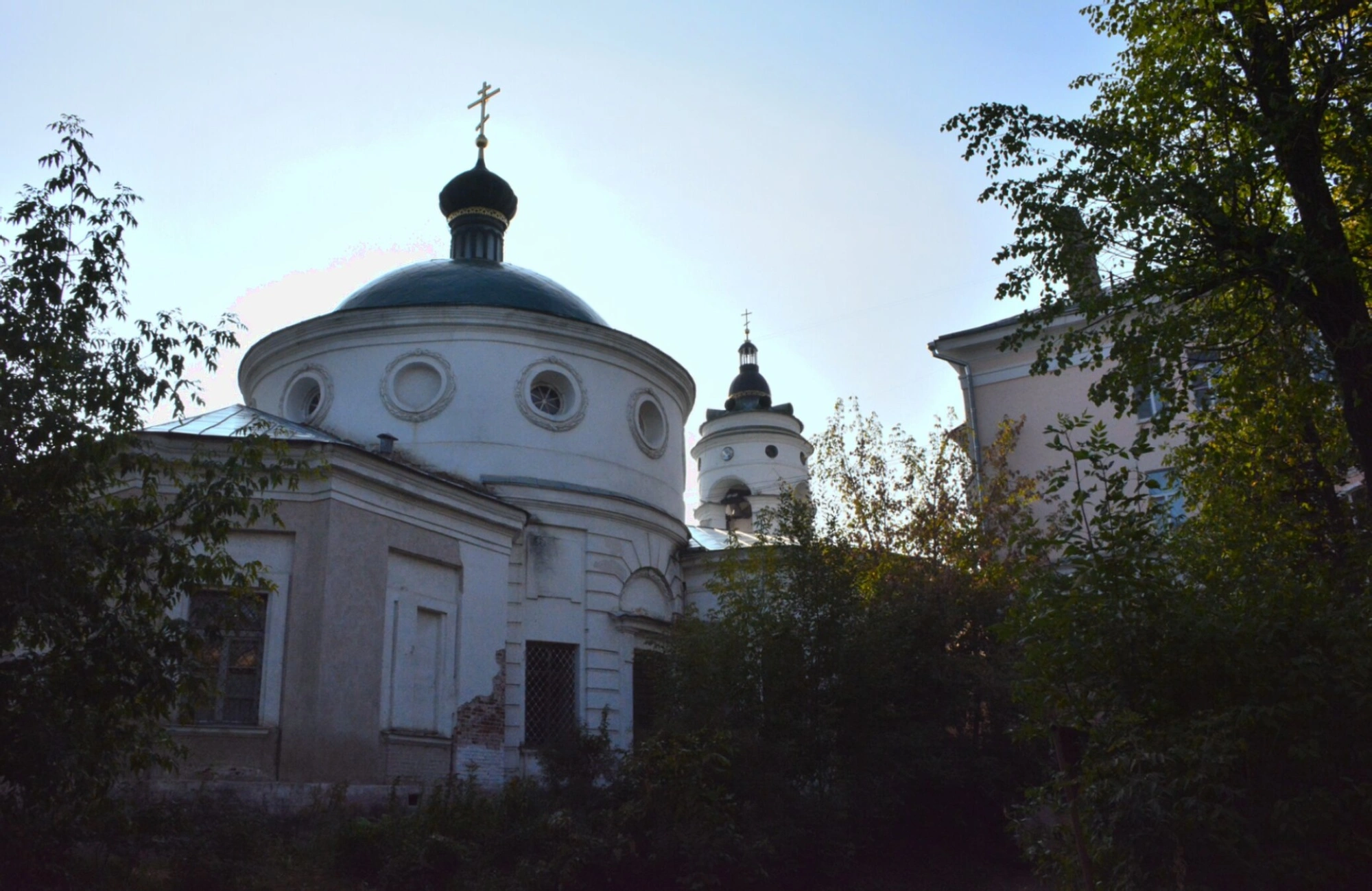 На фотографии запечатлена Скорбященская церковь в Твери — действующий православный храм Тверской и Кашинской епархии, освященный в честь чудотворных икон Божией Матери «Живоносный Источник» и «Всех скорбящих Радость». Белоснежное каменное здание с зеленым куполом, увенчанным крестом, демонстрирует уникальную для тверской архитектуры объемную семигранную алтарную часть и ротондальную основу. Храм располагается по адресу: улица Андрея Дементьева, дом 1 (бывшая Скорбященская улица).