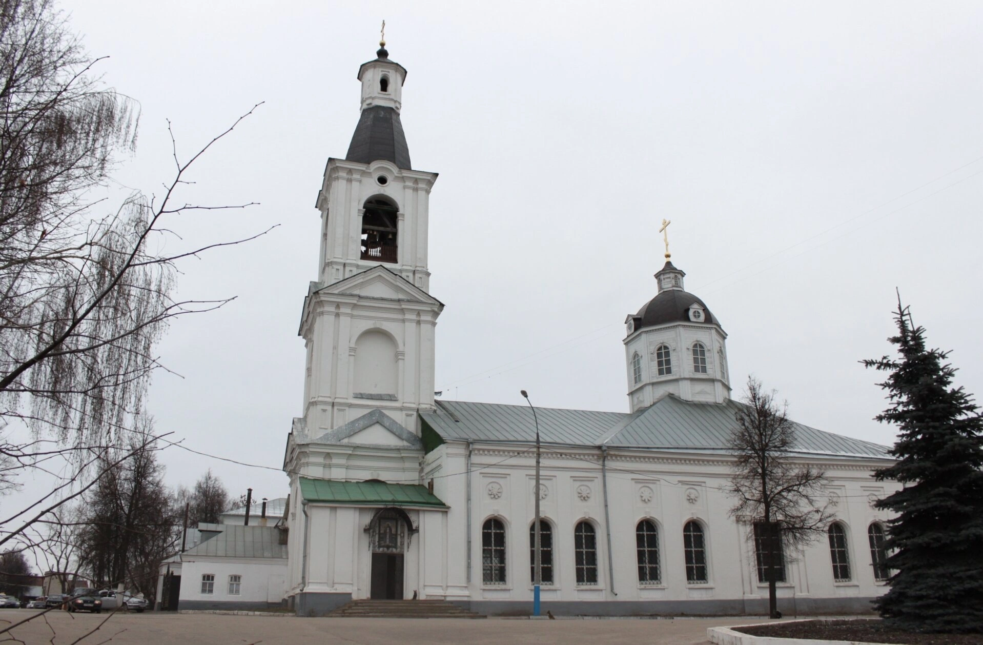 На представленной фотографии запечатлена жемчужина православного зодчества — храм в честь иконы Божией Матери «Живоносный Источник», расположенный в историческом центре города Арзамаса Нижегородской области. Белоснежный каменный собор, сияющий даже под пасмурным небом, является ярким представителем русского классицизма в церковной архитектуре.