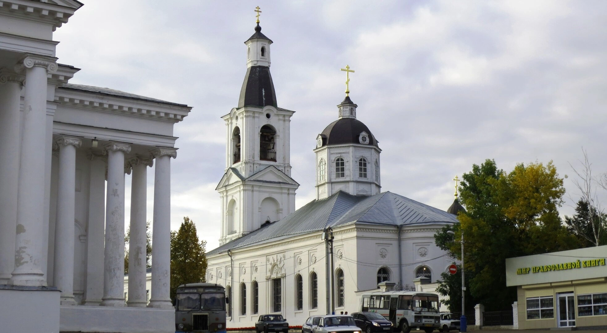 Справа от святыни расположен одноэтажный дом с вывеской «Мир православной книги», где верующие могут приобрести духовную литературу и церковную утварь. Присутствие современных автомобилей напоминает о том, что древний храм продолжает свою жизнь в современном мире, оставаясь центром духовного притяжения для православных христиан.