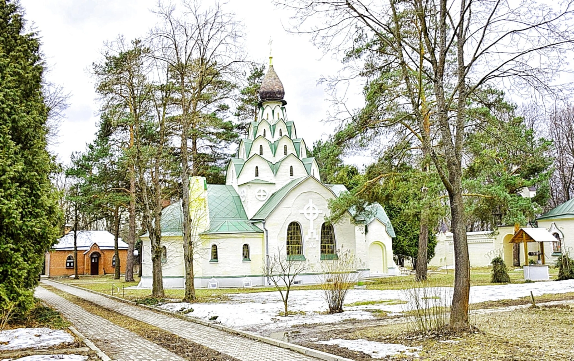 На фотографии хорошо просматривается компактный размер храма, что характерно для скитских церквей, предназначенных для небольшой общины монашествующих. Архитектурный облик храма отражает духовные устремления русских зодчих начала прошлого века, стремившихся возродить национальные традиции церковного строительства. Расположение скита в живописной местности Подмосковья создает особую атмосферу молитвенного уединения и покоя, что ощущается даже через фотографическое изображение святой обители.