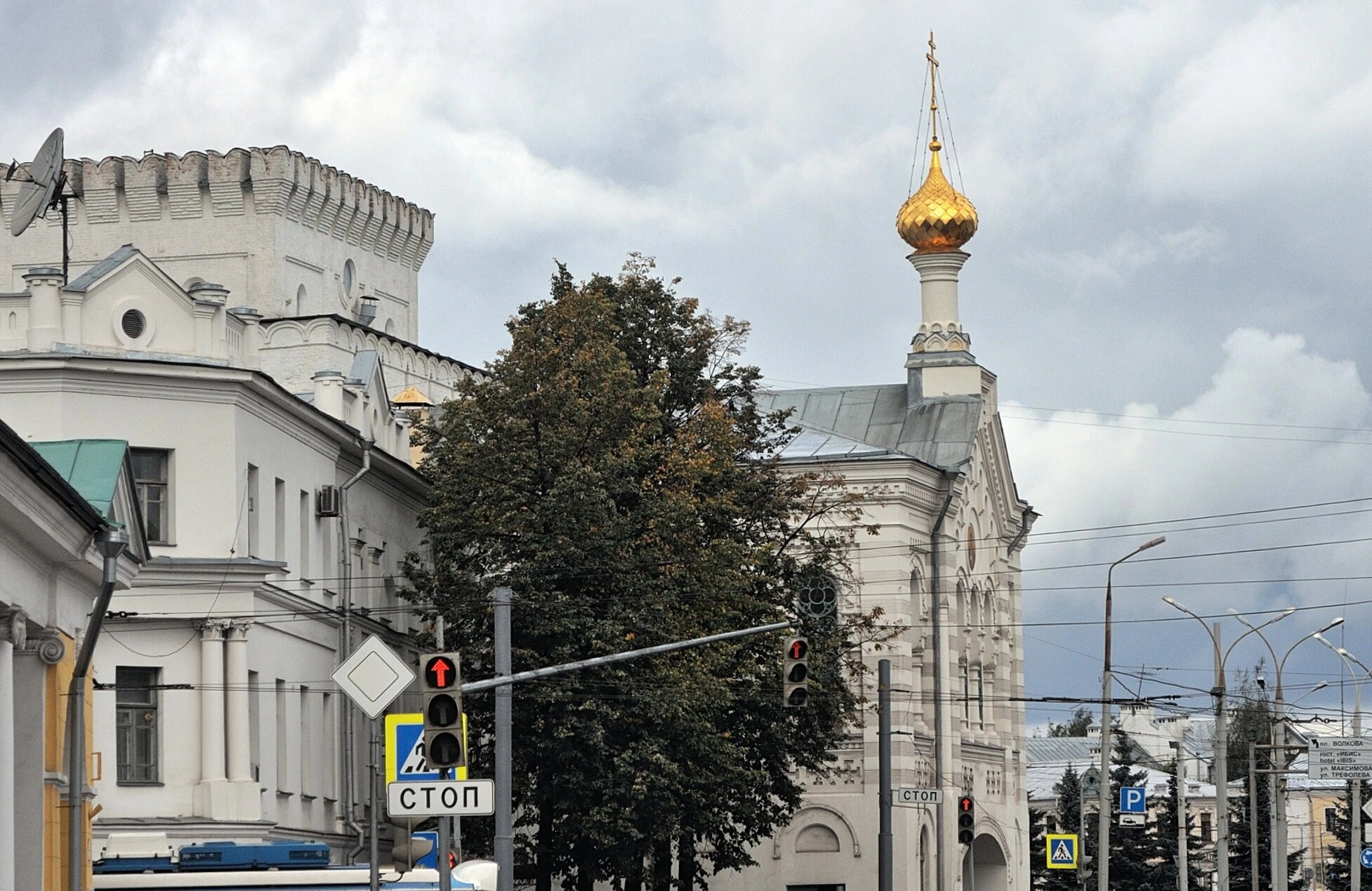 На фотографии запечатлён уникальный архитектурный и духовный ансамбль в центре Ярославля — Церковь иконы Божией Матери «Знамение», пристроенная к исторической Власьевской башне. Этот комплекс ярко символизирует собой многовековую историю города, сочетая в себе древние оборонительные сооружения и православную святыню.