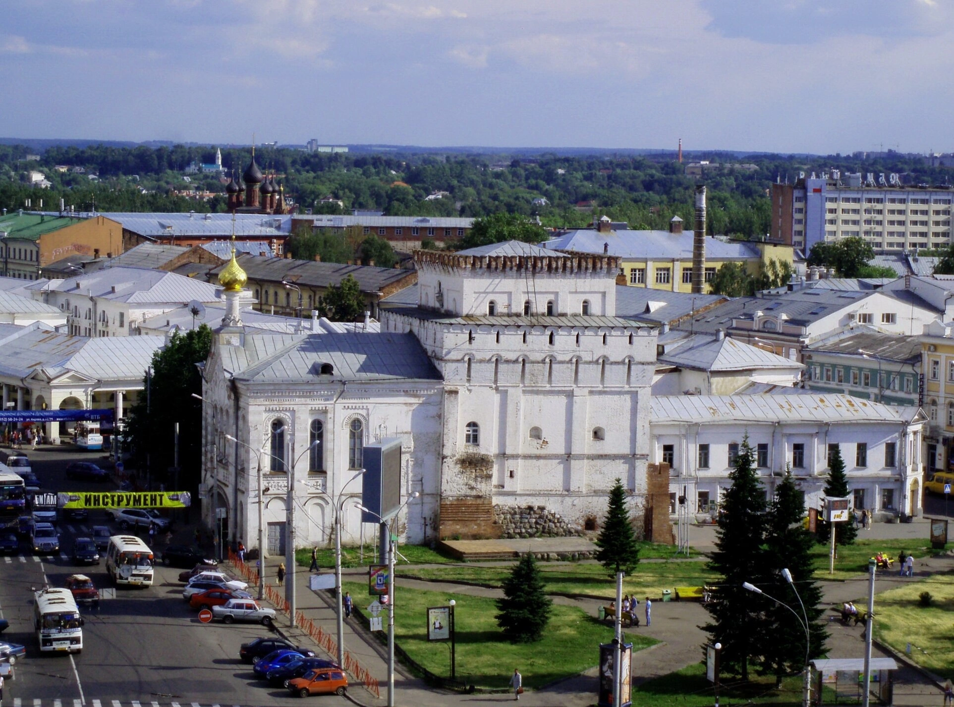 На представленной фотографии запечатлён уникальный исторический ансамбль в самом сердце древнего Ярославля — величественная Церковь в честь иконы Божией Матери «Знамение» и примыкающая к ней мощная Знаменская (Власьевская) башня. Этот вид, открывающийся с высоты, передаёт неразрывную связь духовного и оборонительного начал в истории русского града.