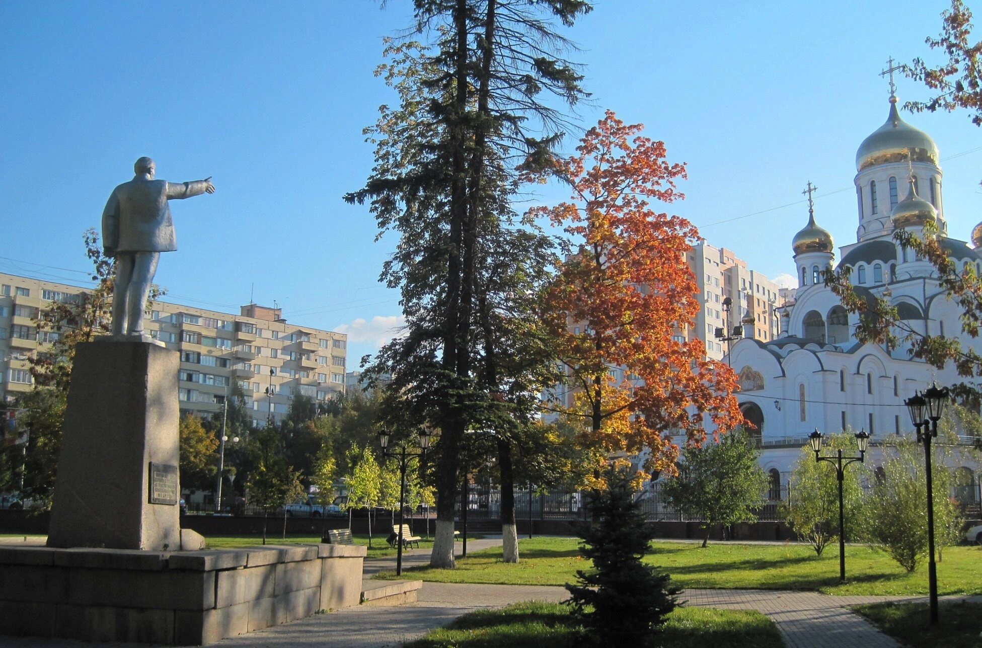 На переднем плане, в парковой зоне слева, установлен монументальный памятник, предположительно В. И. Ленину. Скульптура на высоком постаменте запечатлена в характерной динамичной позе с указующей вперед рукой. Это соседство исторических эпох — духовной и идеологической — составляет уникальную особенность данного ландшафта, рассказывая о сложных вехах в истории нашего Отечества.
