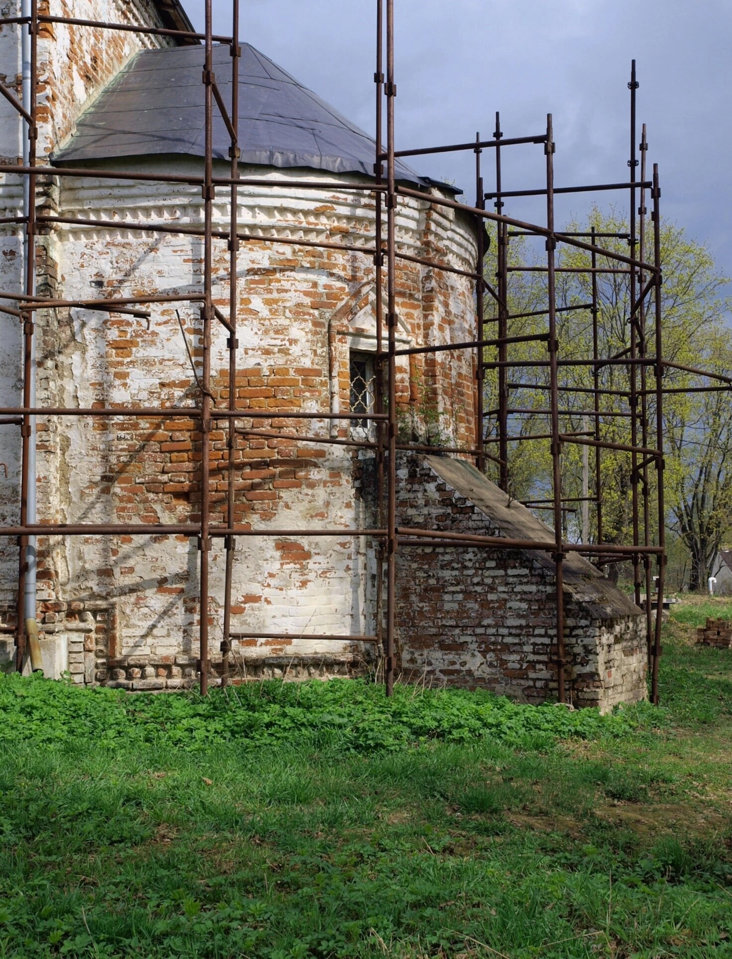 На представленной фотографии запечатлена Церковь иконы Божией Матери «Знамение», расположенная в селе Аннино Наро-Фоминского городского округа Московской области. Храм находится в стадии активной реставрации, о чём красноречиво свидетельствуют установленные по всему периметру здания строительные леса. Несмотря на видимые следы разрушения кирпичной кладки, сооружение сохраняет свои величественные архитектурные формы и духовную значимость.