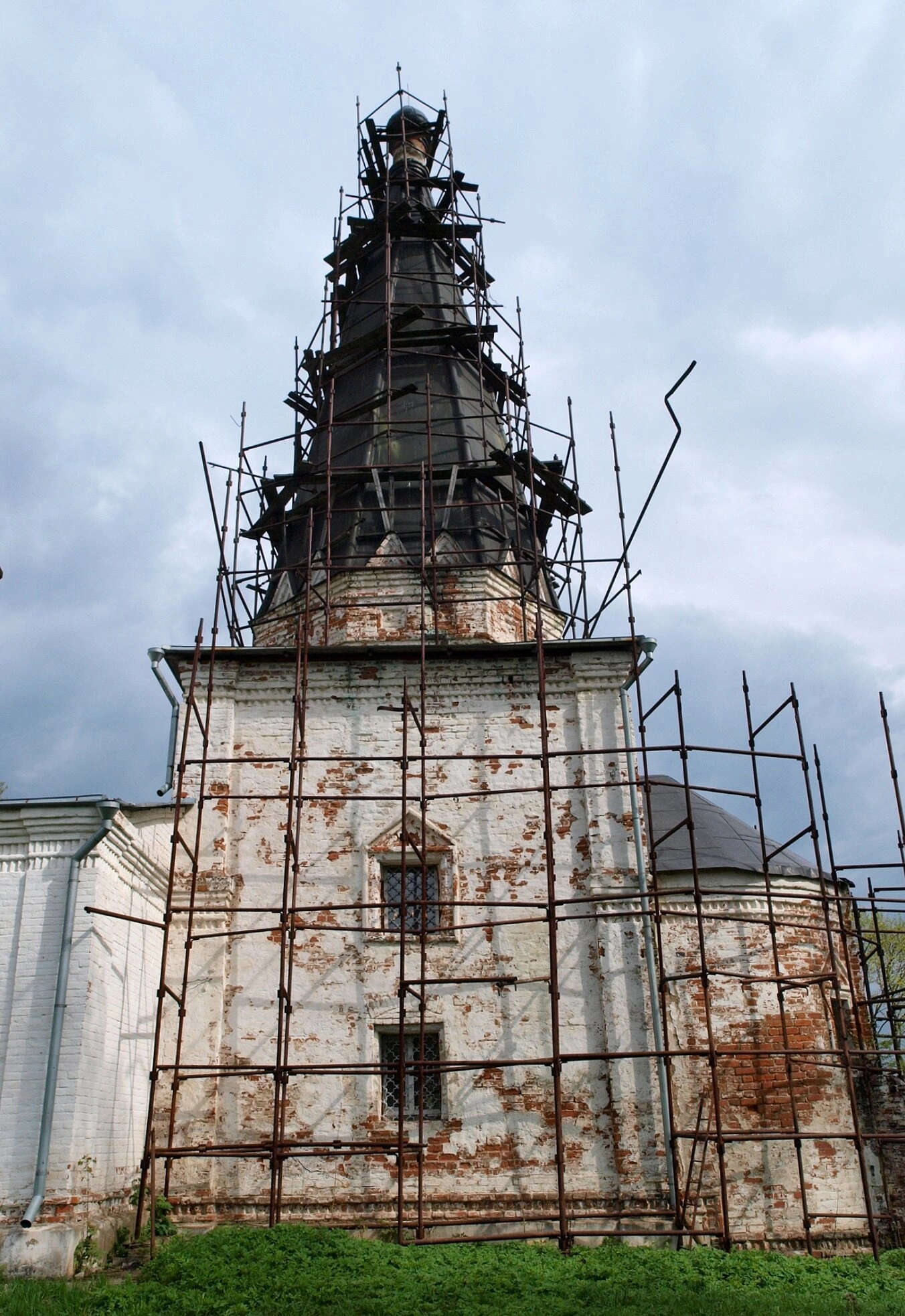 На представленной фотографии запечатлена Церковь иконы Божией Матери «Знамение», расположенная в селе Аннино Московской области. Храм, являющийся объектом культурного наследия, находится на реставрации, о чём свидетельствуют установленные строительные леса, окружающие его колокольню и шатровую часть.