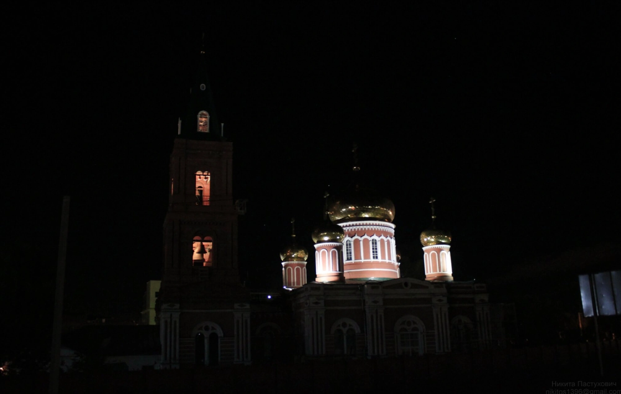 На представленной фотографии запечатлён величественный вид Церкви в честь иконы Божией Матери «Знамение» в ночное время. Храм является центральным собором Знаменского женского монастыря в Барнауле. Его золочёные купола, увенчанные православными крестами, и стройная колокольня ярко освещены искусным световым оформлением, что создаёт ощущение благодати и неземного свечения.