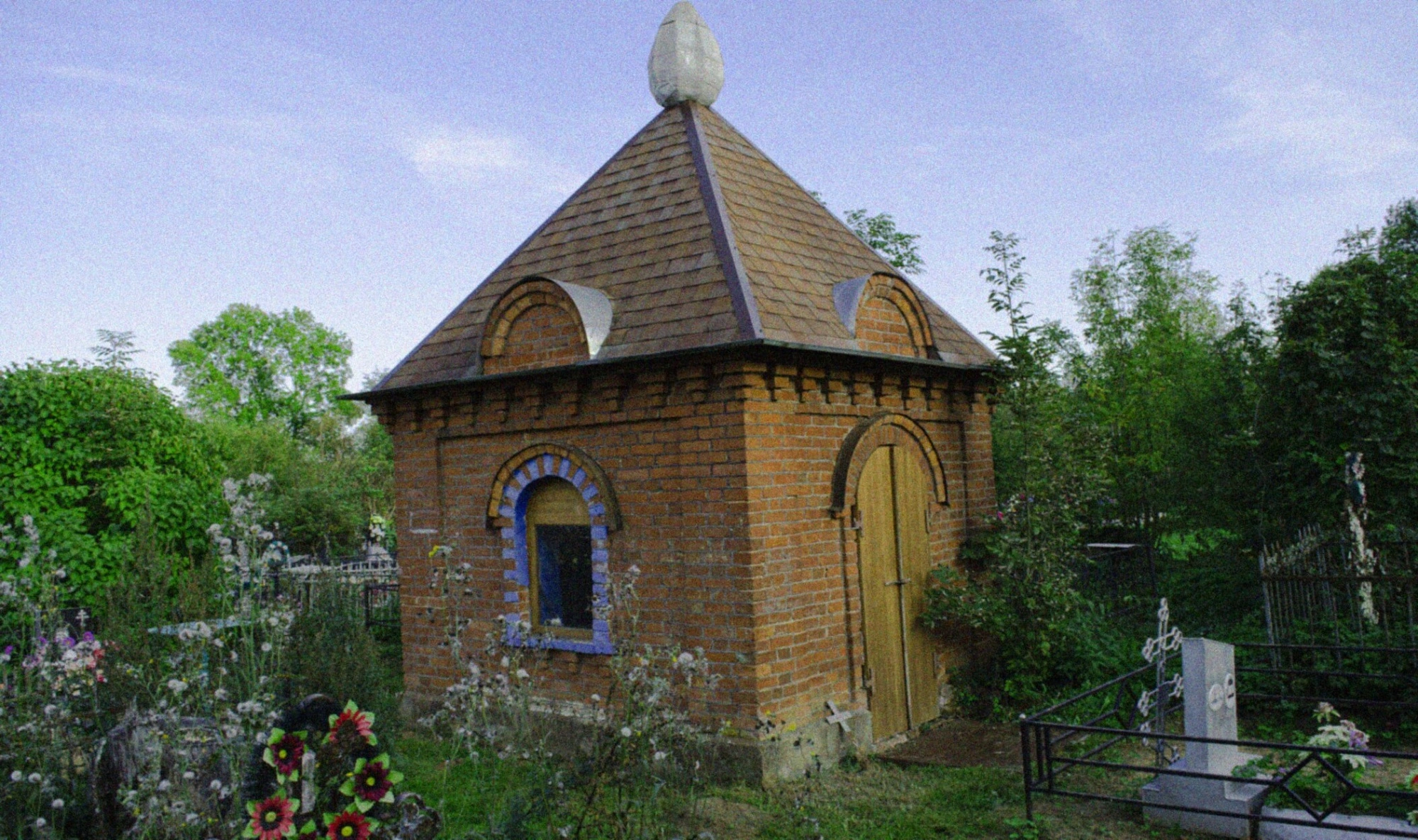 Вокруг храма располагается кладбище с надгробиями и крестами, где нашли упокоение многие поколения прихожан. Пышная растительность и цветы на переднем плане фотографии создают атмосферу благоговейной памяти и вечного упокоения, напоминая о надежде на воскресение и жизнь вечную для всех верующих во Христа.