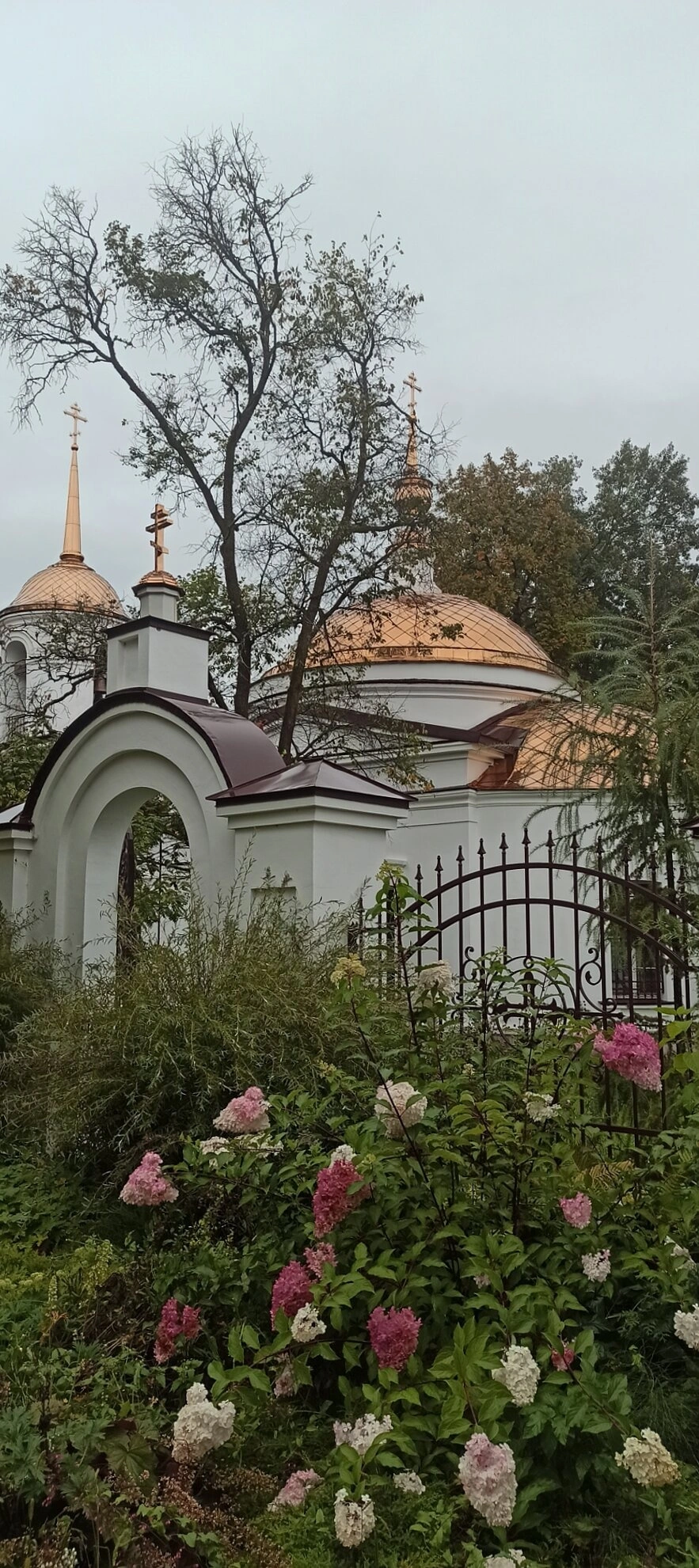 Территория вокруг храма благоустроена и окружена густой зеленью, что создает особую атмосферу умиротворения и благодати. Справа от церковного здания виднеются цветущие кустарники с розовыми и белыми соцветиями, напоминающие гортензии. Высокие деревья с пышной листвой обрамляют храм, а раскидистое безлистное дерево придает пейзажу особый колорит. Перед церковью установлен темный металлический забор, ограждающий святую территорию и подчеркивающий особый статус этого места.