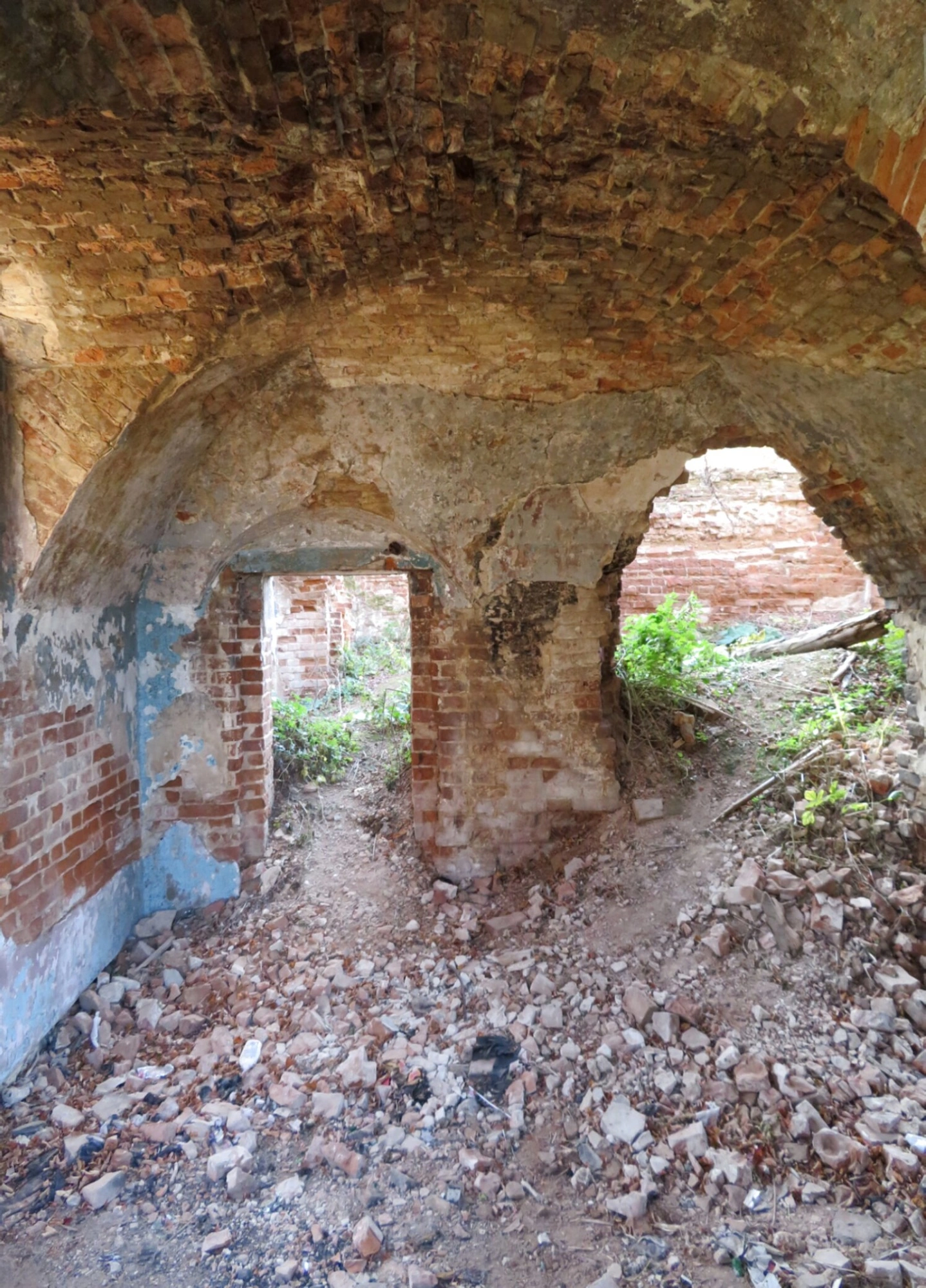 Нынешнее состояние храмового пространства вызывает чувство светлой печали. Естественный свет, льющийся через пустые оконные проёмы и проломы в кровле, озаряет открытую кирпичную кладку и фрагменты утраченной штукатурки. На сводах и стенах видны следы разрушительного действия времени, а на полу покоятся фрагменты кирпичей и строительный мусор. Присутствие дикорастущей растительности внутри святых стен подчёркивает длительное забвение, постигшее это благодатное место.
