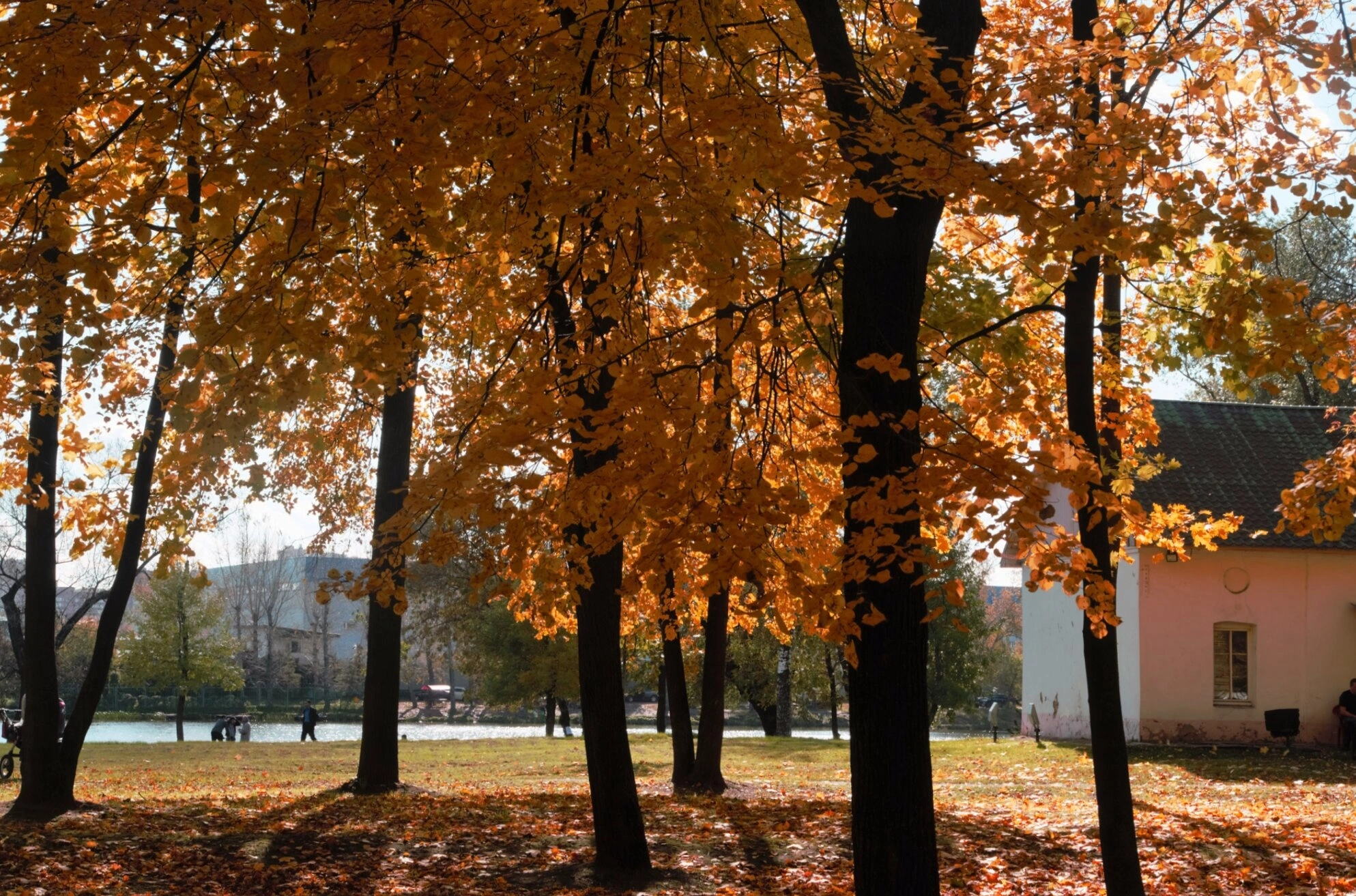 Осенний пейзаж окружает храм золотистым убранством. Деревья с пожелтевшей листвой обрамляют белоснежные стены церковного здания, а земля устлана ковром из опавших листьев. Солнечный свет, проникая сквозь ветви, озаряет святыню и создаёт благодатную атмосферу умиротворения.