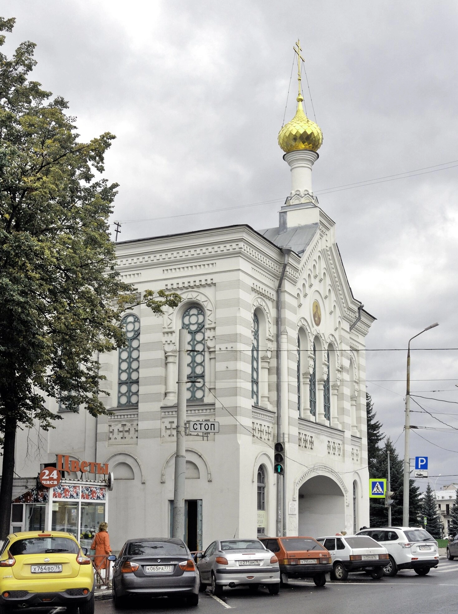 Осенняя листва дерева, виднеющегося слева от храма, добавляет кадру особое настроение и мягкость. Пасмурное небо с облаками создаёт рассеянное освещение, которое подчёркивает благородную белизну стен церкви и сияние её купола. Несмотря на окружающую современность, Знаменская церковь сохраняет свой неизменный духовный облик и продолжает оставаться важным центром православной жизни Ярославля.