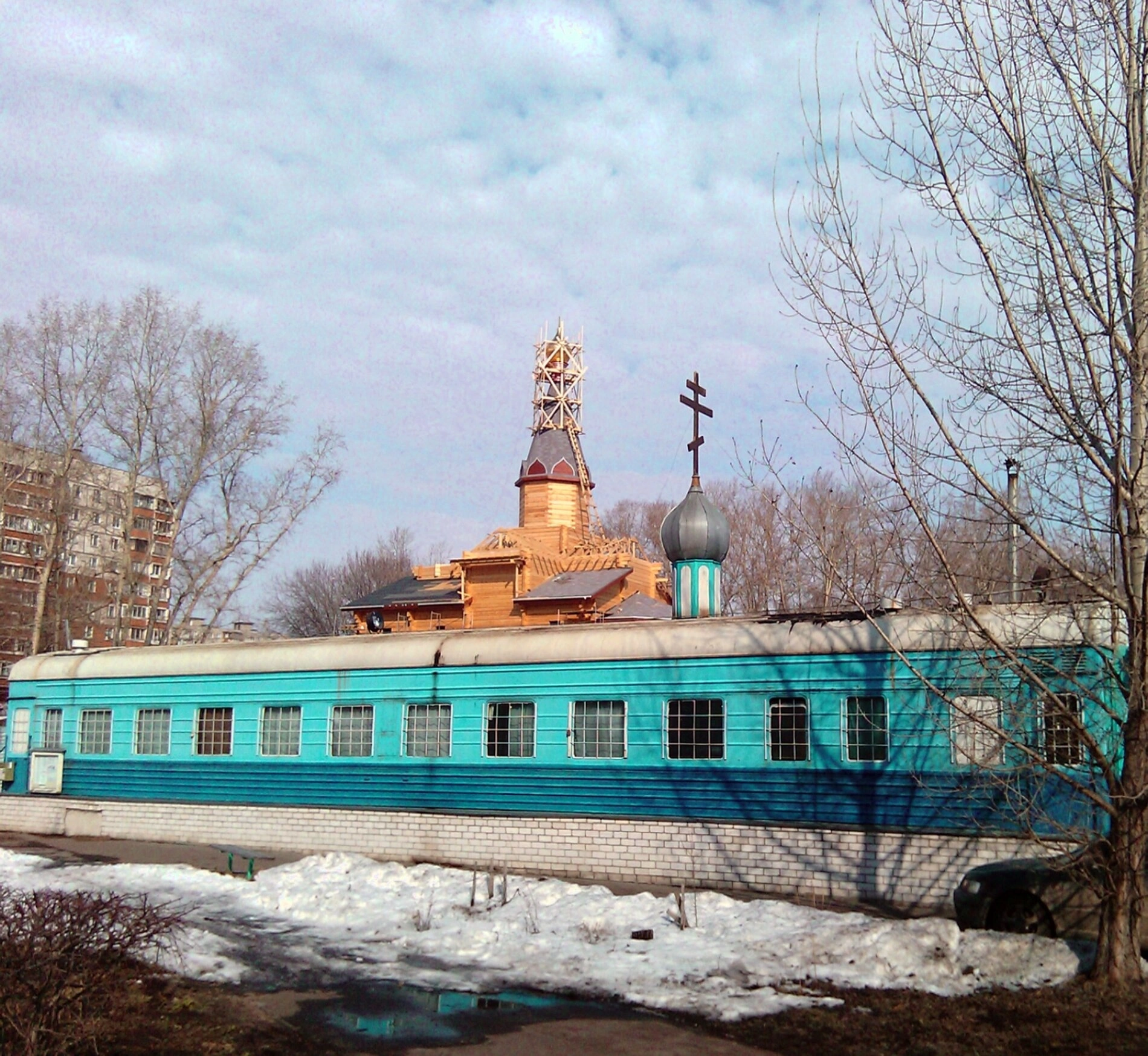 На переднем плане фотографии виден синий вагон, превращённый в молитвенный дом. На его крыше возвышается деревянная колокольня, увенчанная золочёным куполом и православным крестом, а также дополнительный синий купол с крестом. Зимний пейзаж дополняет атмосферу снимка: заснеженная земля, деревья без листвы и многоквартирные жилые дома на заднем плане.
