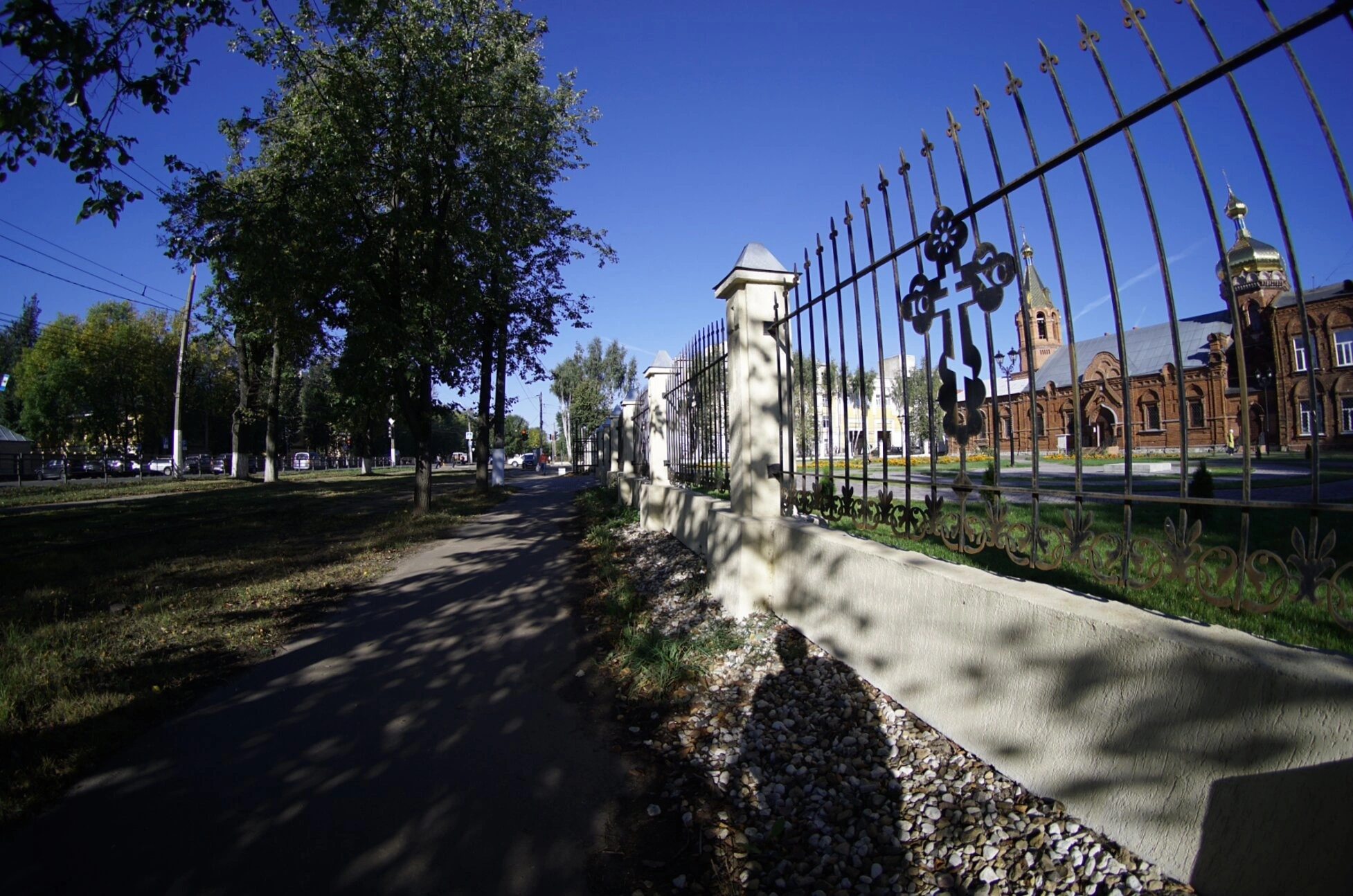 На переднем плане фотографии видна изящная кованая ограда с православными крестами, установленная на каменном основании. Эта ограда не только обозначает границы церковной территории, но и символически отделяет мирское пространство от святого места. За оградой простирается ухоженная территория, выложенная мелкой галькой.