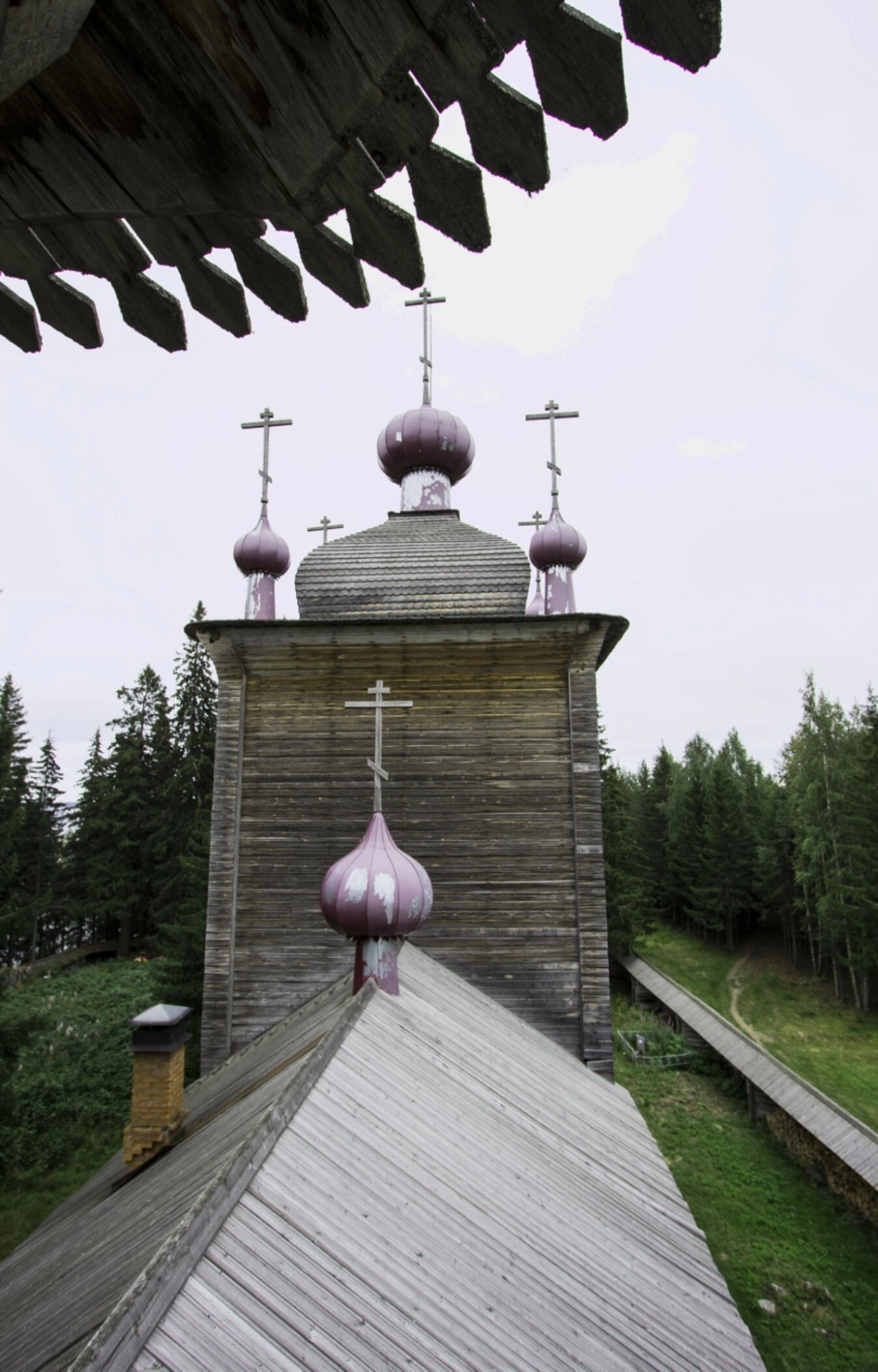 На фотографии запечатлена церковь Ильи Пророка, центральный храм Ильинского Водлозерского погоста, расположенного на острове Малый Колгостров в пределах Водлозерского национального парка. Этот уникальный памятник деревянного зодчества был возведен в 1798 году тщанием местных прихожан на месте обветшавшей шатровой церкви.