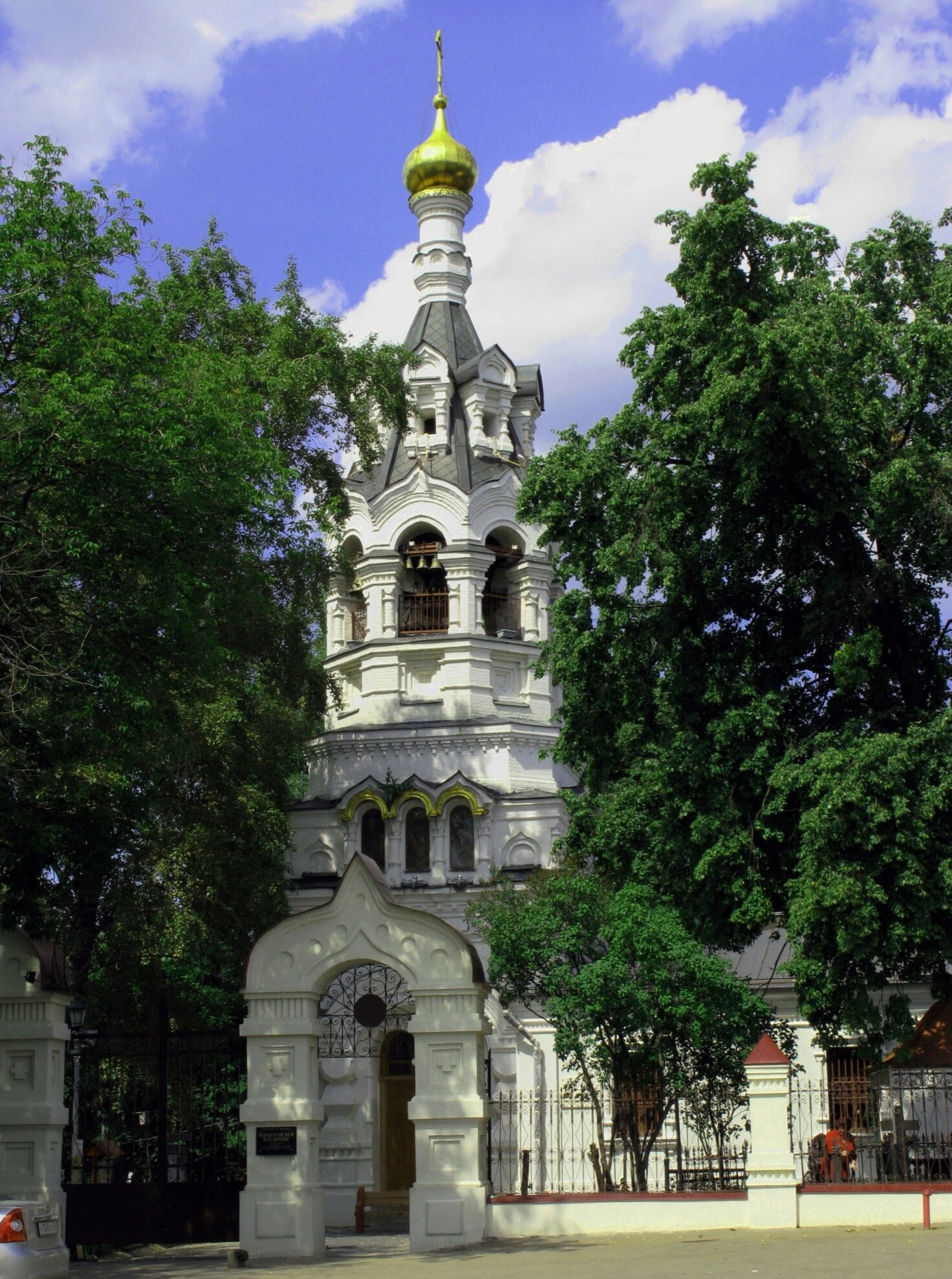 Храм окружают густые зеленые насаждения, создающие естественное обрамление для церковного здания. В передней части комплекса просматривается ограждение из белого камня с коваными металлическими воротами и арочным проемом, ведущим ко святому входу. Небесная лазурь с легкими облачными образованиями свидетельствует о ясном дне, когда был сделан снимок.