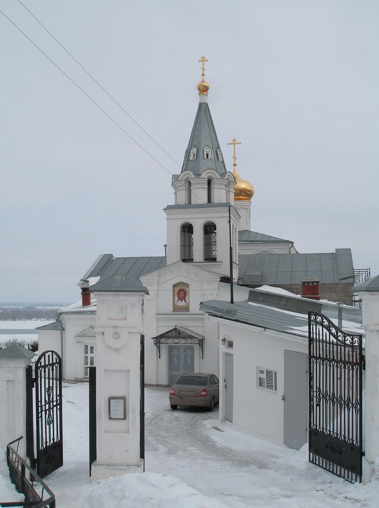 Передний план фотографии открывается видом на церковную ограду. Каменные столбы и ажурные кованые ворота чёрного цвета обозначают границу между мирской суетой и пространством молитвы. Справа от основного здания располагается небольшое одноэтажное строение, вероятно, церковная сторожка или иное служебное помещение, необходимое для жизни прихода. Припаркованный у дороги автомобиль напоминает о современности, но не нарушает общего настроения отрешённости и покоя.