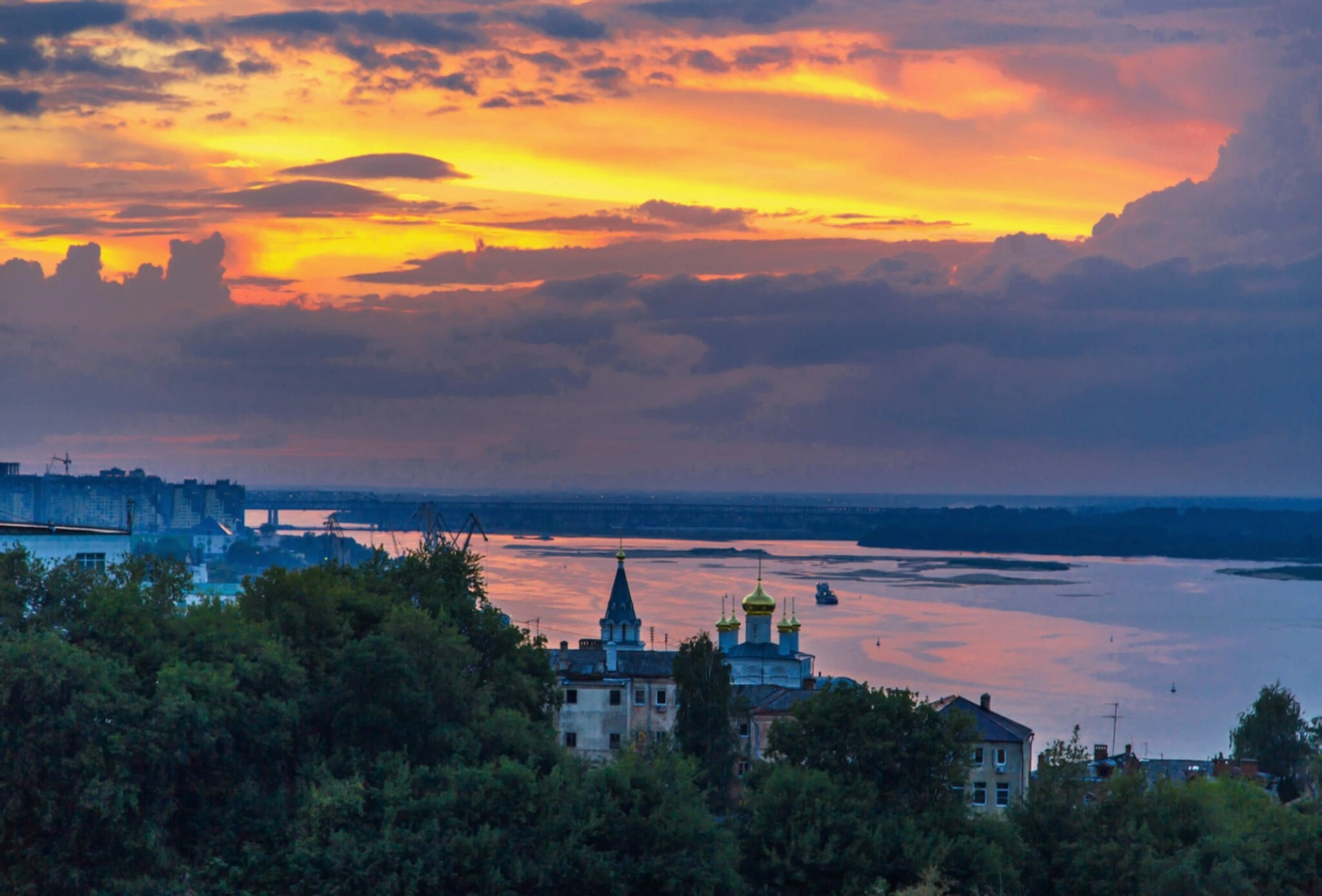 На заднем плане открывается панорамный вид на водную гладь, где встречаются воды Оки и Волги. Широкая речная гладь отражает последние лучи заходящего солнца, окрашивающие небосвод в божественные оттенки - от золотисто-оранжевых до нежно-розовых и глубоких фиолетовых тонов. На горизонте виднеются силуэты городских построек, создающие ощущение гармонии между творением рук человеческих и природной красотой.