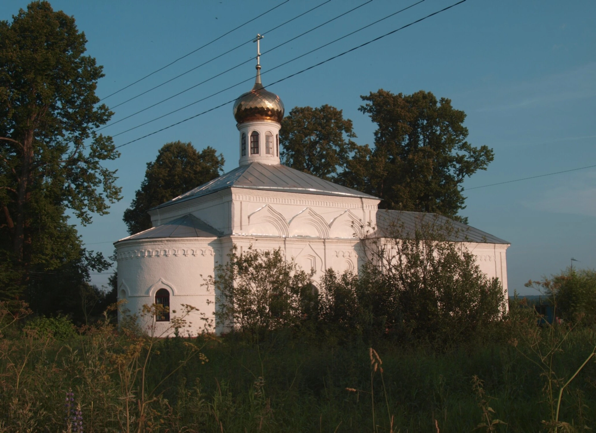 Церковь окружает живописный природный ландшафт: высокая трава, кустарники и деревья создают естественное обрамление для святыни. На фоне ясного голубого неба образ храма приобретает особую духовную значимость и величие. Присутствие линий электропередач на заднем плане напоминает о современном контексте существования памятника православной культуры.