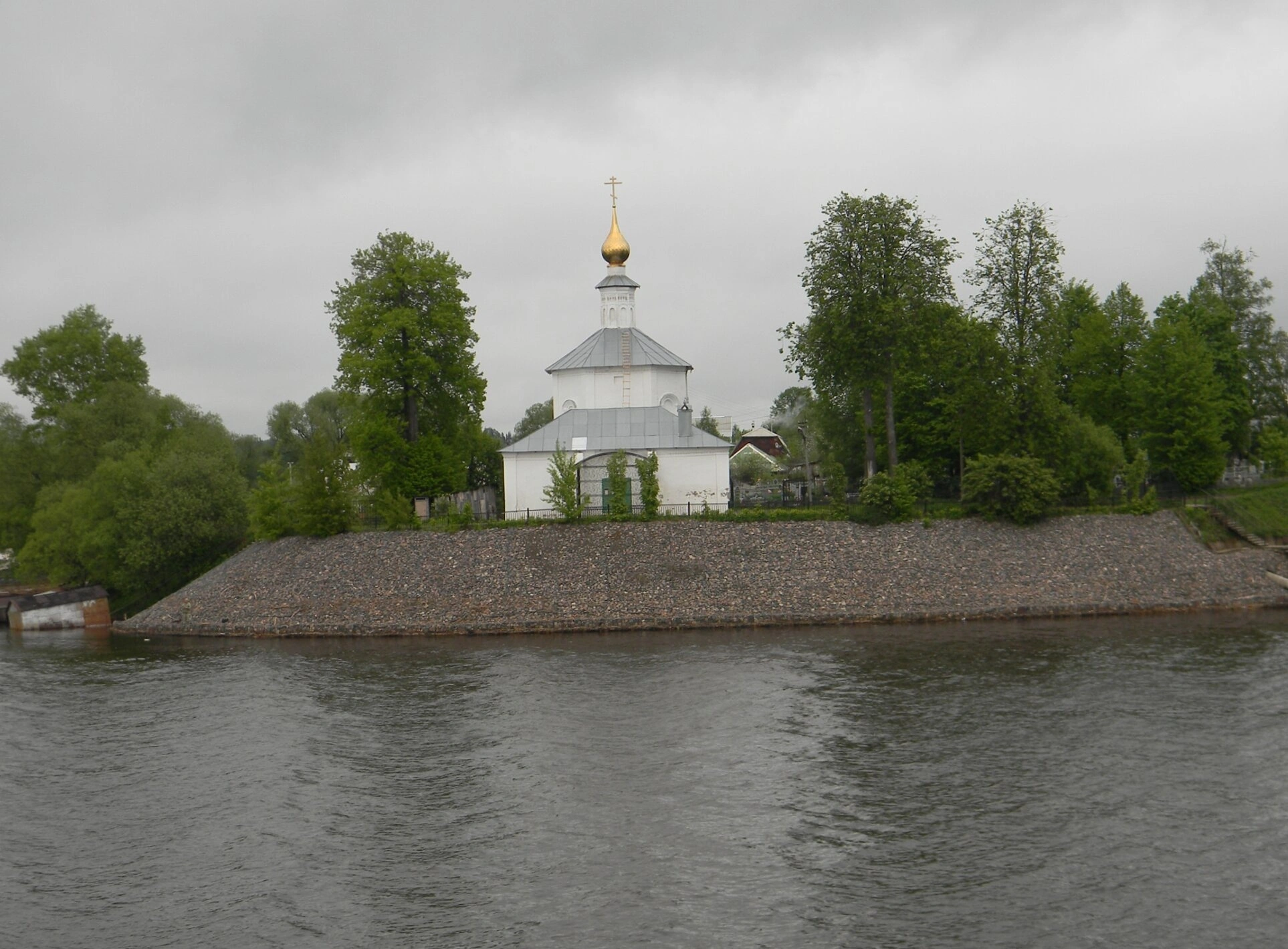 Белоснежный одноглавый храм с позолоченным куполом представляет собой образец классической русской церковной архитектуры. Арочные оконные проёмы и строгие формы здания свидетельствуют о традициях православного зодчества. Церковь органично вписана в природное окружение, стоя на укреплённом каменными глыбами возвышенном берегу.