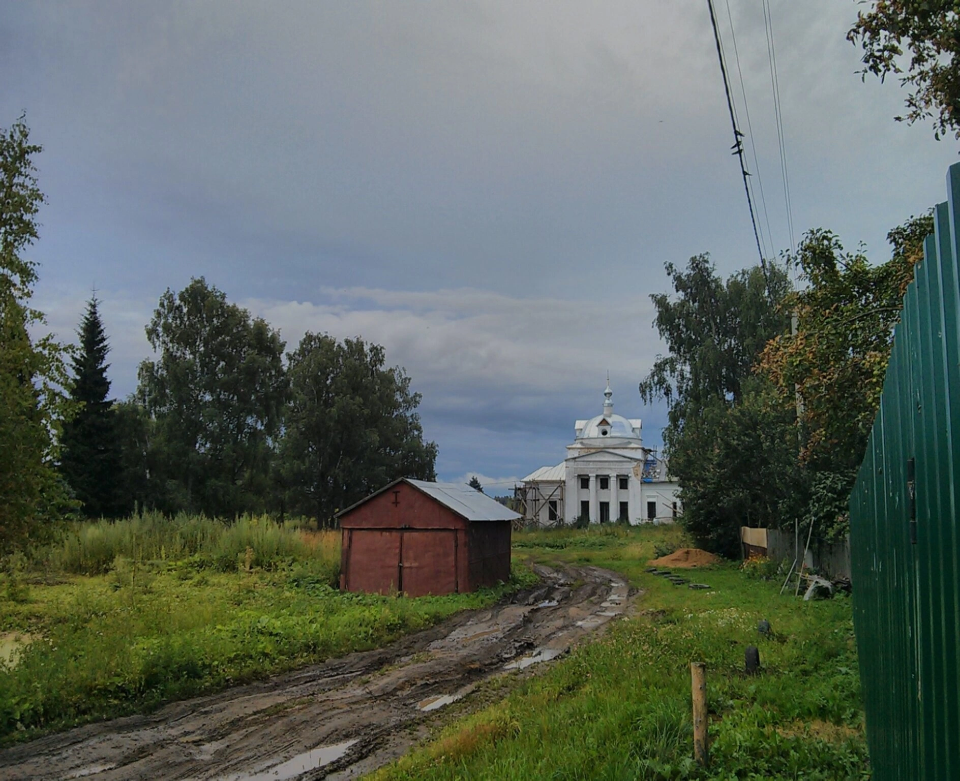 Подход к храму осуществляется по грунтовой дороге, что подчеркивает сельскую атмосферу места. Слева от дороги расположена хозяйственная постройка — небольшой красный сарай под двускатной крышей. Справа вдоль пути установлен зеленый металлический забор, ограждающий прихрамовую территорию.