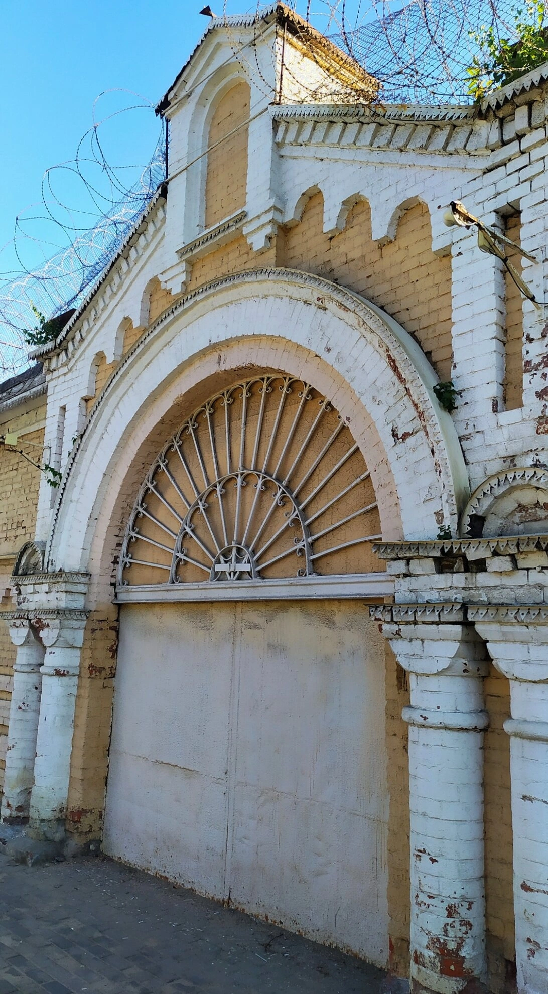 Центральным композиционным элементом снимка является величественный арочный проем, обрамленный пилястрами с капителями. Внутри арки установлена изящная металлическая решетка, выполненная в виде веера с радиально расходящимися прутьями, что свидетельствует о высоком мастерстве кузнечных работ.