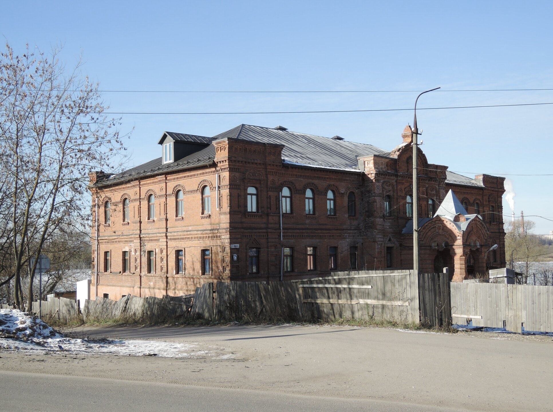 На представленной фотографии запечатлена церковь Ильи Пророка, расположенная на территории Спасо-Вифанского монастыря в Сергиевом Посаде. Архитектурный облик храма представляет собой трехэтажное каменное здание, выполненное из красного кирпича и увенчанное двускатной кровлей.