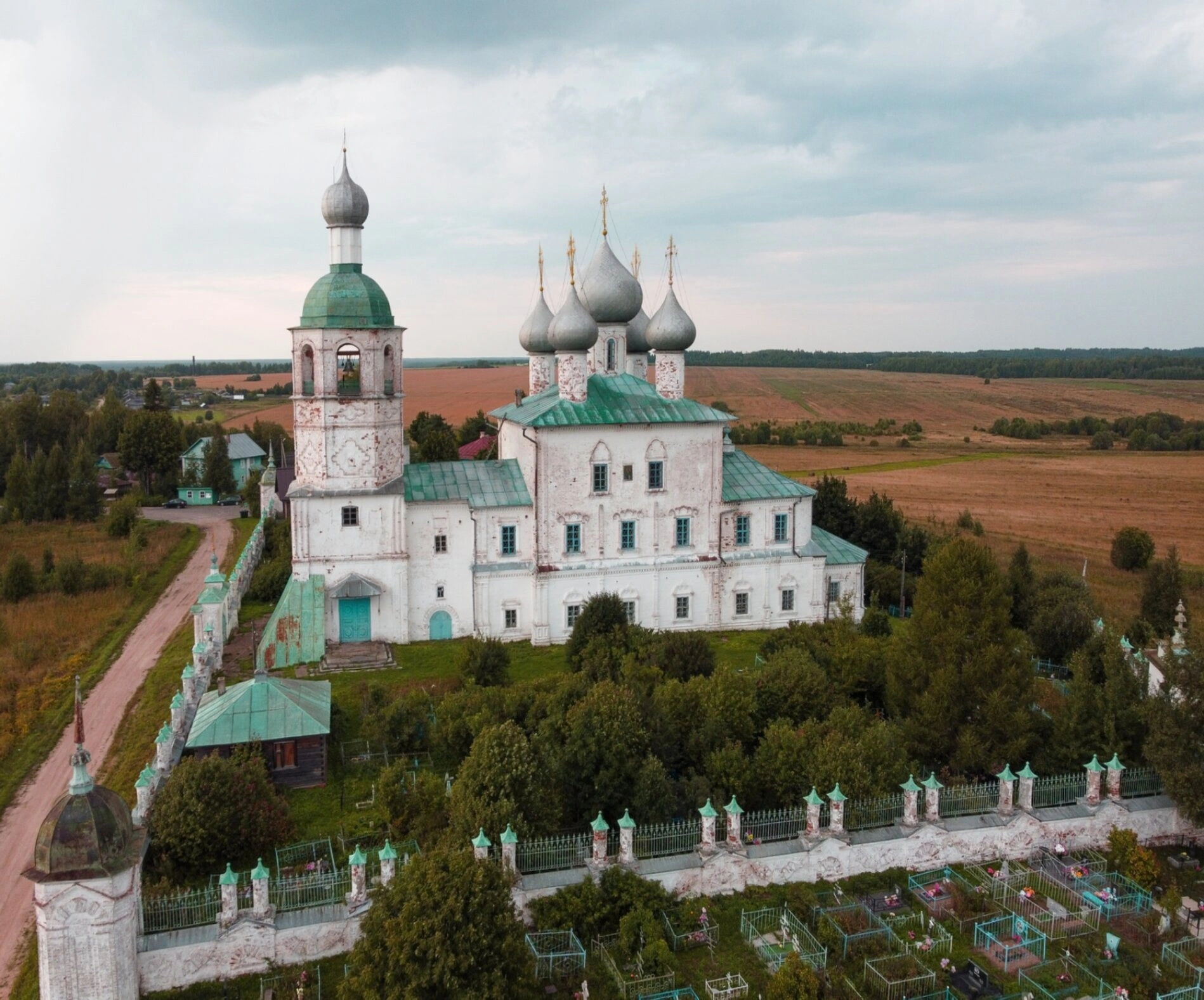На представленной фотографии запечатлён храмовый комплекс Ильинского погоста в селе Засодимье Вологодской области, с доминирующим образом Церкви во имя святого славного пророка Божия Илии. Этот святой образец церковного зодчества, расположенный по точным координатам 59.52974800; 40.34480000, является не только архитектурной доминантой округи, но и важным духовным центром, свидетельствующим о глубокой вере и благочестии местных жителей.