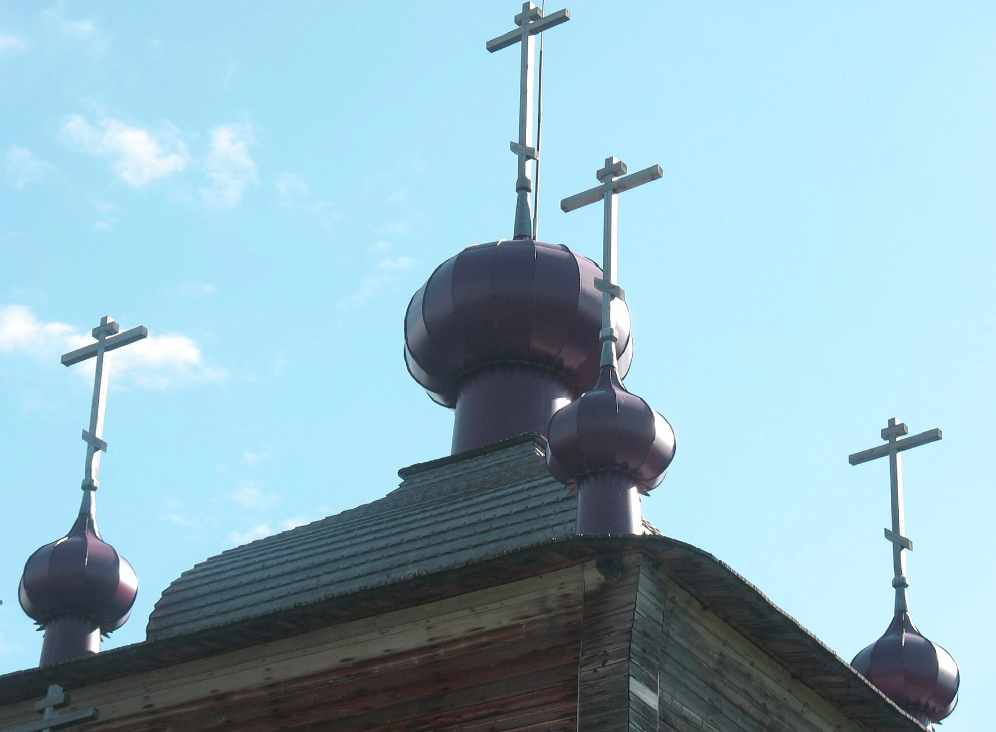 На представленной фотографии запечатлена верхняя часть деревянной Церкви во имя святого пророка Божия Илии, расположенной на территории Ильинского погоста в Водлозерском национальном парке. Храм возвышается на живописном берегу Водлозера, в месте, издревле освящённом молитвами православных подвижников.