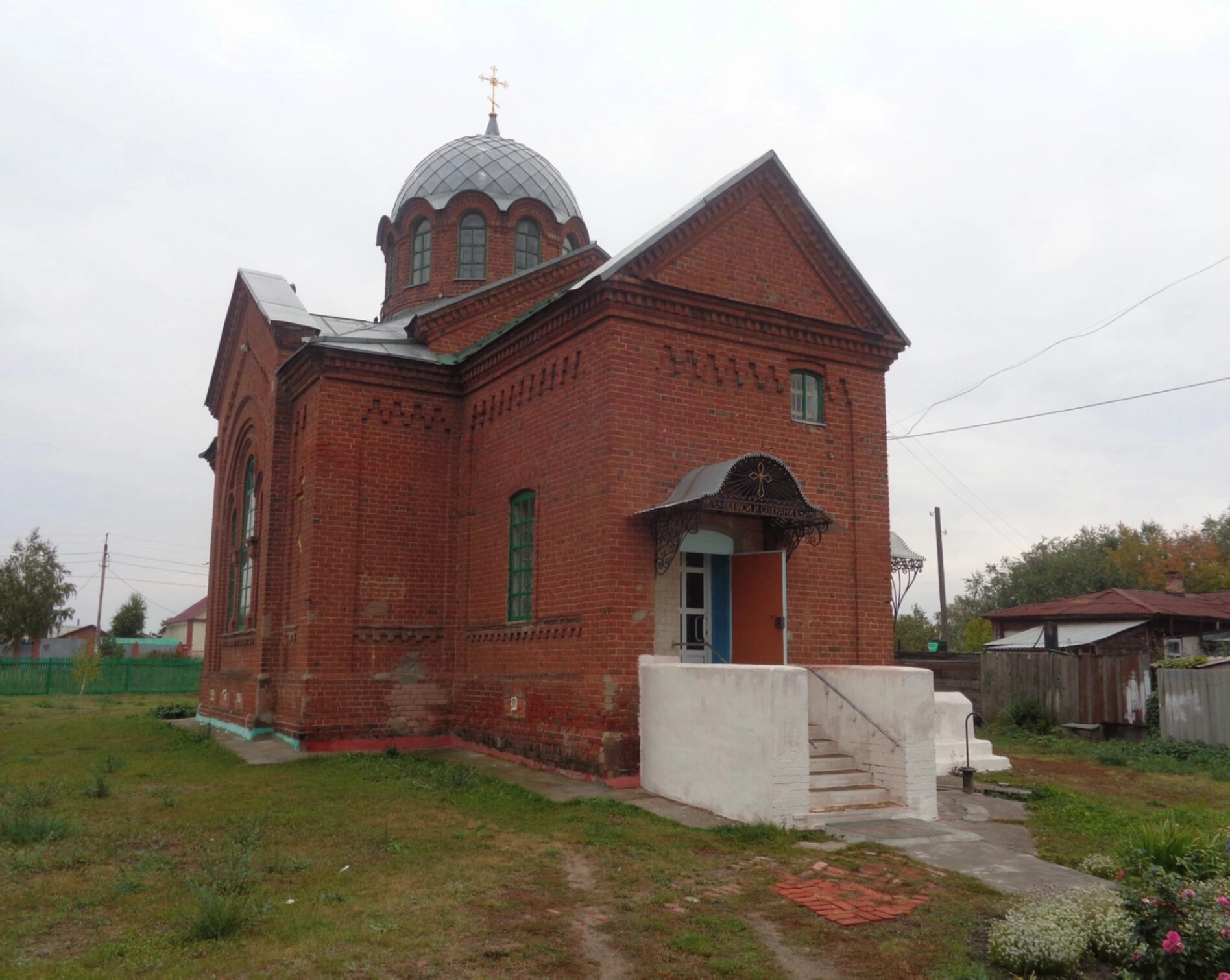 Особого внимания заслуживают детали внешнего убранства. Оконные рамы храма окрашены в насыщенный бирюзовый цвет, создающий выразительный контраст с кирпичной кладкой. Главный вход оформлен небольшой лестницей с перилами и защищён кованым козырьком с декоративной решёткой. Храмовая территория обнесена невысокой оградой, а окружающий ландшафт дополняют деревья и кустарники.