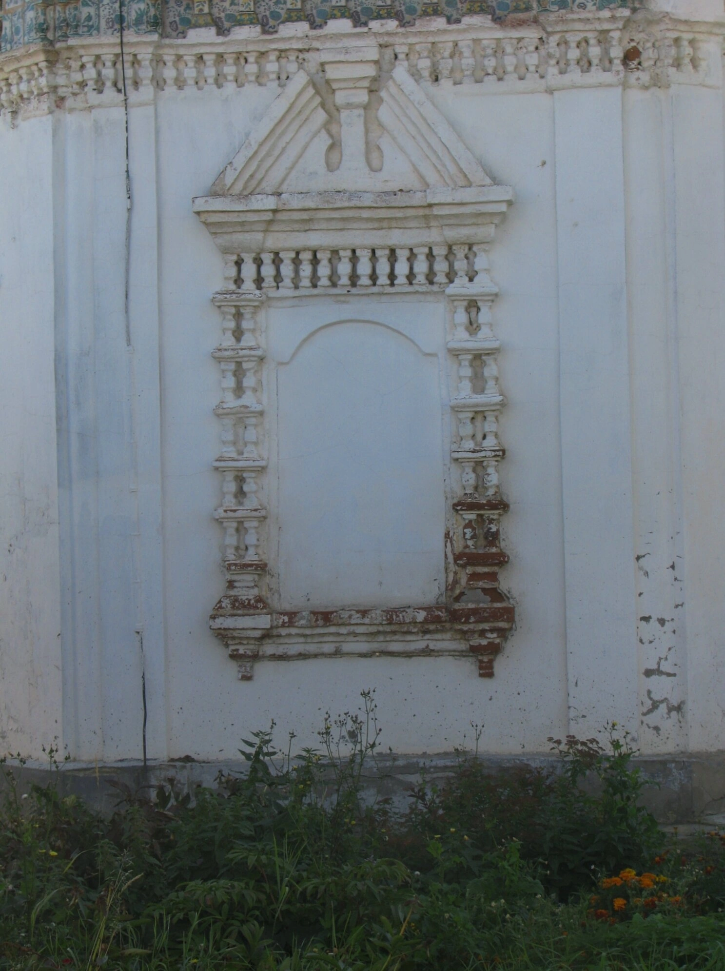 В центре композиции находится прямоугольная ниша с арочным завершением, изящно обрамлённая архитектурными деталями, стилизованными под балюстраду и колонны. Верхняя часть ниши украшена изысканной лепниной, напоминающей карниз с фронтоном. Первоначально здание было выполнено в белом цвете, что символизировало духовную чистоту и благодать.