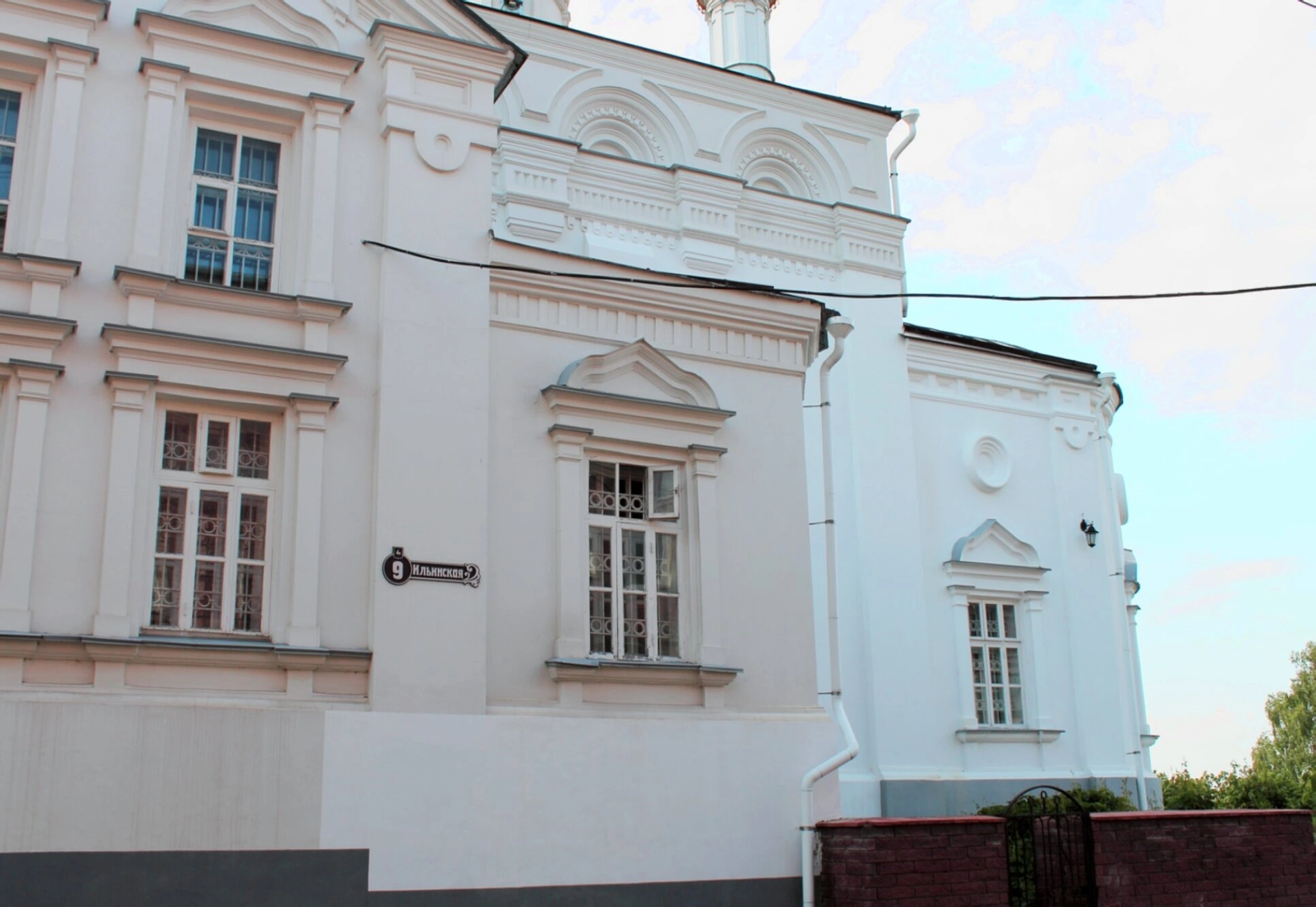 Белоснажный храмовый комплекс демонстрирует характерные черты русской православной архитектуры. Фасад здания украшают изящные арочные оконные проёмы, создающие особый духовный настрой. На стене чётко просматривается уличная табличка с указанием номера дома и названия улицы, что позволяет точно идентифицировать местонахождение святой обители.