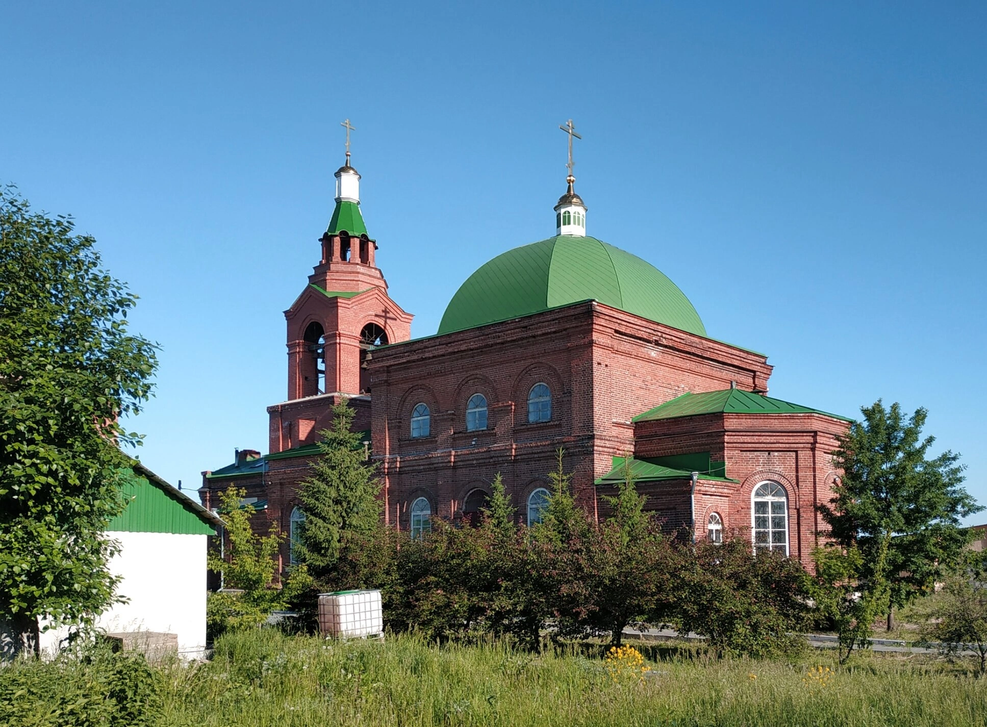 Фасад святыни украшен арочными оконными проемами, обрамленными кирпичным декором. Сочетание фактурного красного кирпича и насыщенной зелени кровли создает яркий и запоминающийся образ. Храм находится в окружении густой растительности: высокие деревья и кустарники, видные на снимке, подчеркивают единение творения Божия и рук человеческих, воздвигнувших этот дом для молитвы. На переднем плане фотографии видна зеленая трава и часть небольшого белого строения, вероятно, относящегося к церковному подворью.