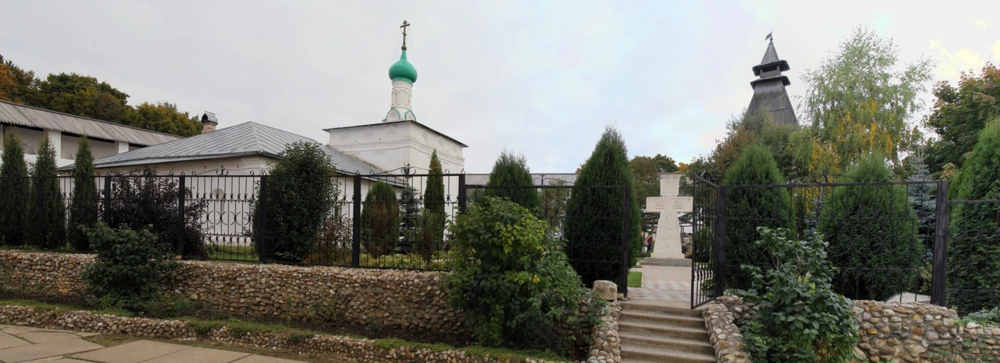 Территория вокруг храма содержится в образцовом порядке, что свидетельствует о заботе братии монастыря о своей святыне. Видны аккуратно подстриженные вечнозелёные насаждения — туи и можжевельники, обрамлённые каменными бордюрами. Металлическая ограда на каменном основании символически отделяет мир духовный от мирского, подчёркивая особый статус этого места. Каменные ступени ведут ко входу, приглашая паломников и богомольцев.