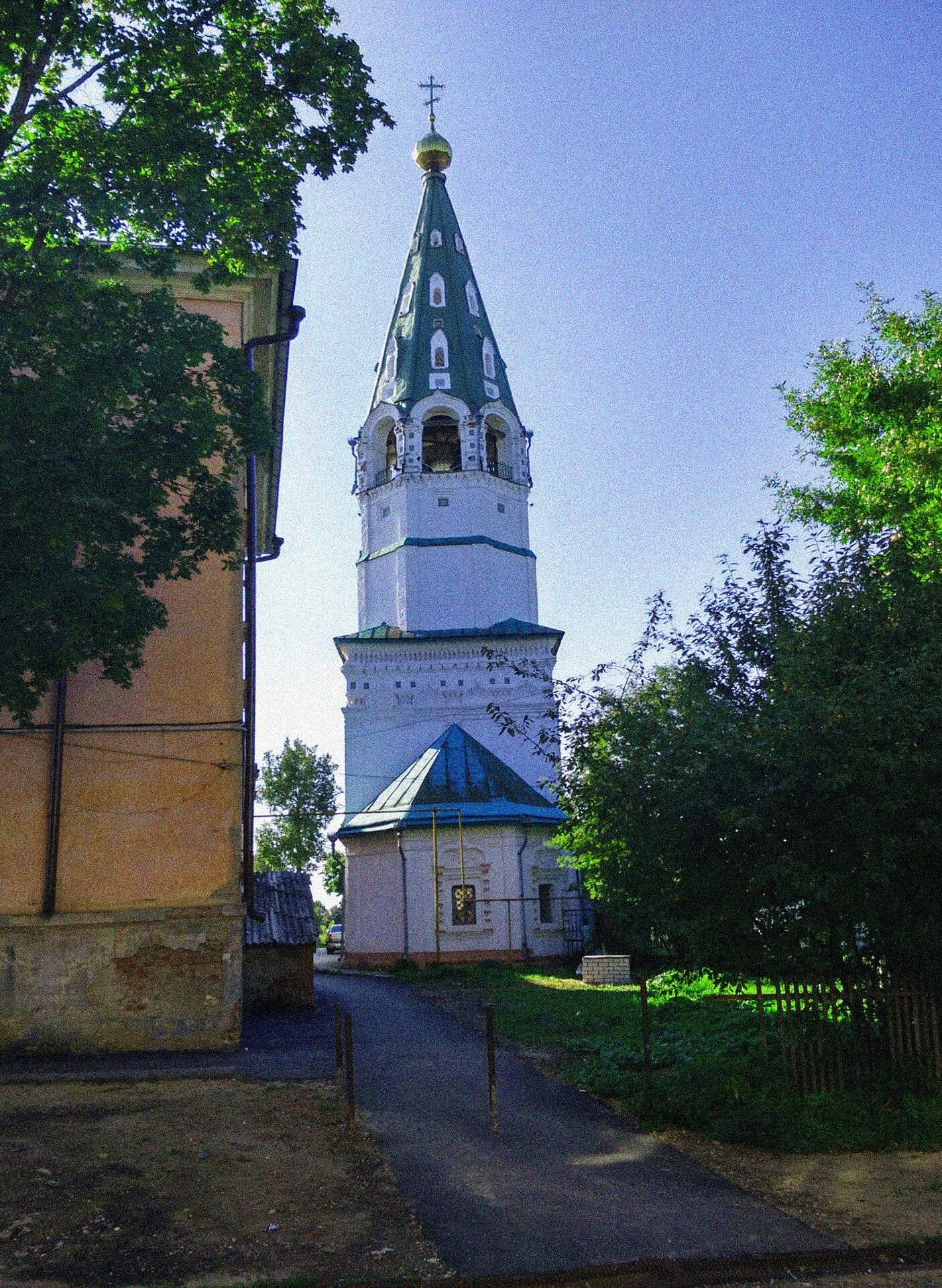На представленной фотографии запечатлена колокольня Церкви Пророка Божия Илии, что в городе Тейково Ивановской области. Это старинный православный храм, являющийся значимым памятником церковной архитектуры и духовным центром города.